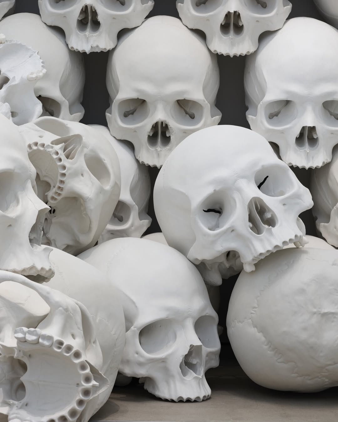 步入展場,迎面而來的是震懾全場的作品《Mass》。由100顆巨大人類頭骨堆疊而成的裝置藝術,不只是視覺上的壓迫,也像在對觀者耳語:「死亡不只是終點,更是回憶與歷史的集體痕跡。」這些頭骨並非等距排列,而是根據場館空間堆疊成獨特構圖,彷彿將觀眾置身其中,成為作品的一份子。