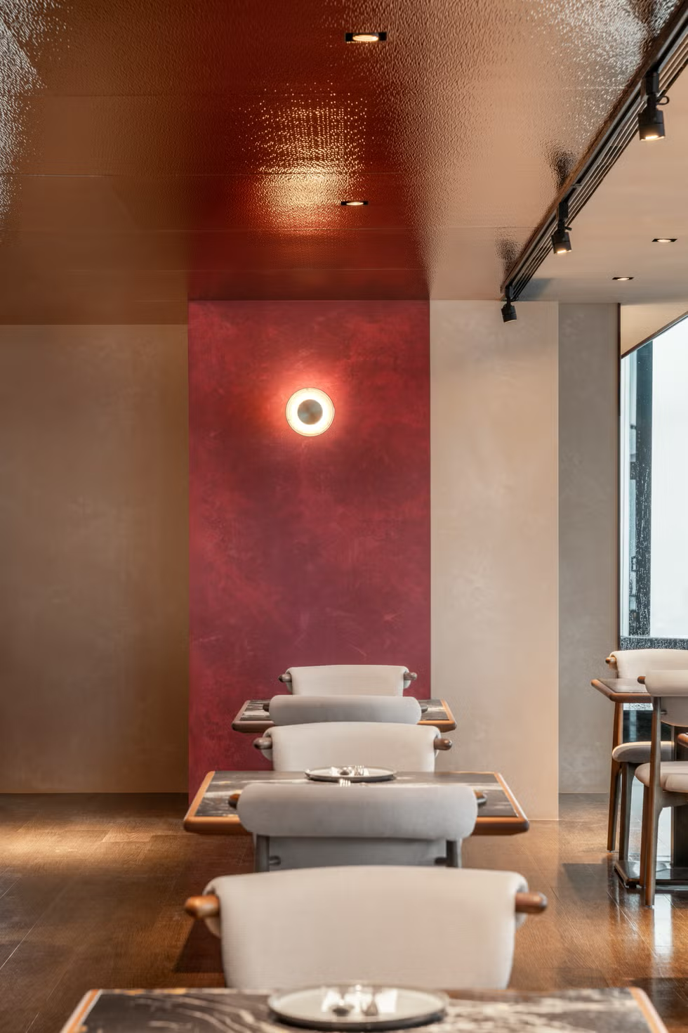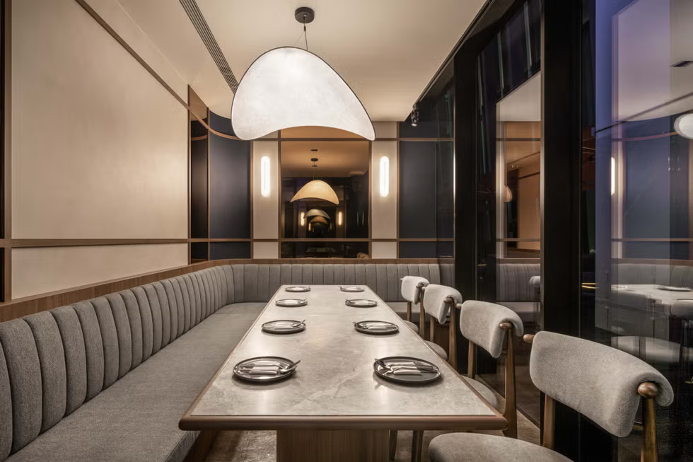餐點由韓裔美籍主廚Hansang Cho操刀,他將自身在韓國與美國間穿梭成長的經歷,轉化為料理靈感。像是融合義式麵疙瘩的辣醬奶油年糕、加上鯷魚與起司的韓式生牛肉,都是熟悉卻帶驚喜的組合。空間設計以斜角木作呼應韓屋意象,搭配大片落地窗與反射鏡面,讓每一餐都在光影與高度中展開。