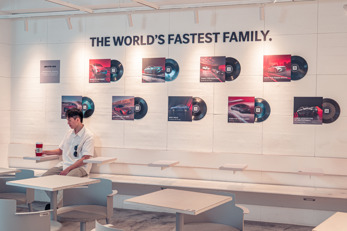 若想感受沈浸式氛圍,可到CAFE!N台北民權、台中公益間市,設有AMG品牌故事牆與車款模型展區,呈現從街道鋼炮到賽道猛獸的進化軌跡。甚至還融入黑膠唱片概念設計,掃描QR Code就能聽到AMG引擎聲與賽道氛圍,就像真的坐進駕駛座。