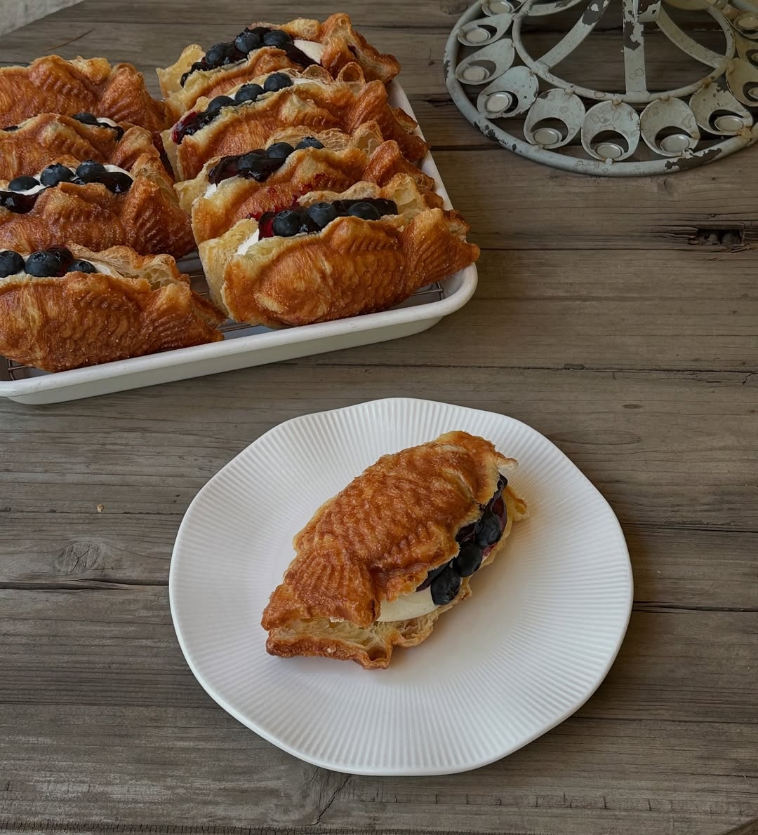 將可頌麵皮取代傳統的鯛魚燒麵皮,麵團塗上糖漿後放入模具中烘烤,內餡則是以法式卡士達的手法調配,內餡外露、絲滑爆漿看起來超欠吃!這次登台口味包含奢華濃郁的「杜拜巧克力」酸甜果香的「草莓卡士達」、清新回甘的「靜岡抹茶」、層次豐富的「黑金巧克力」、經典不敗「紅豆奶油」以及全新研發的韓式「黃豆粉奶油」共6款口味。