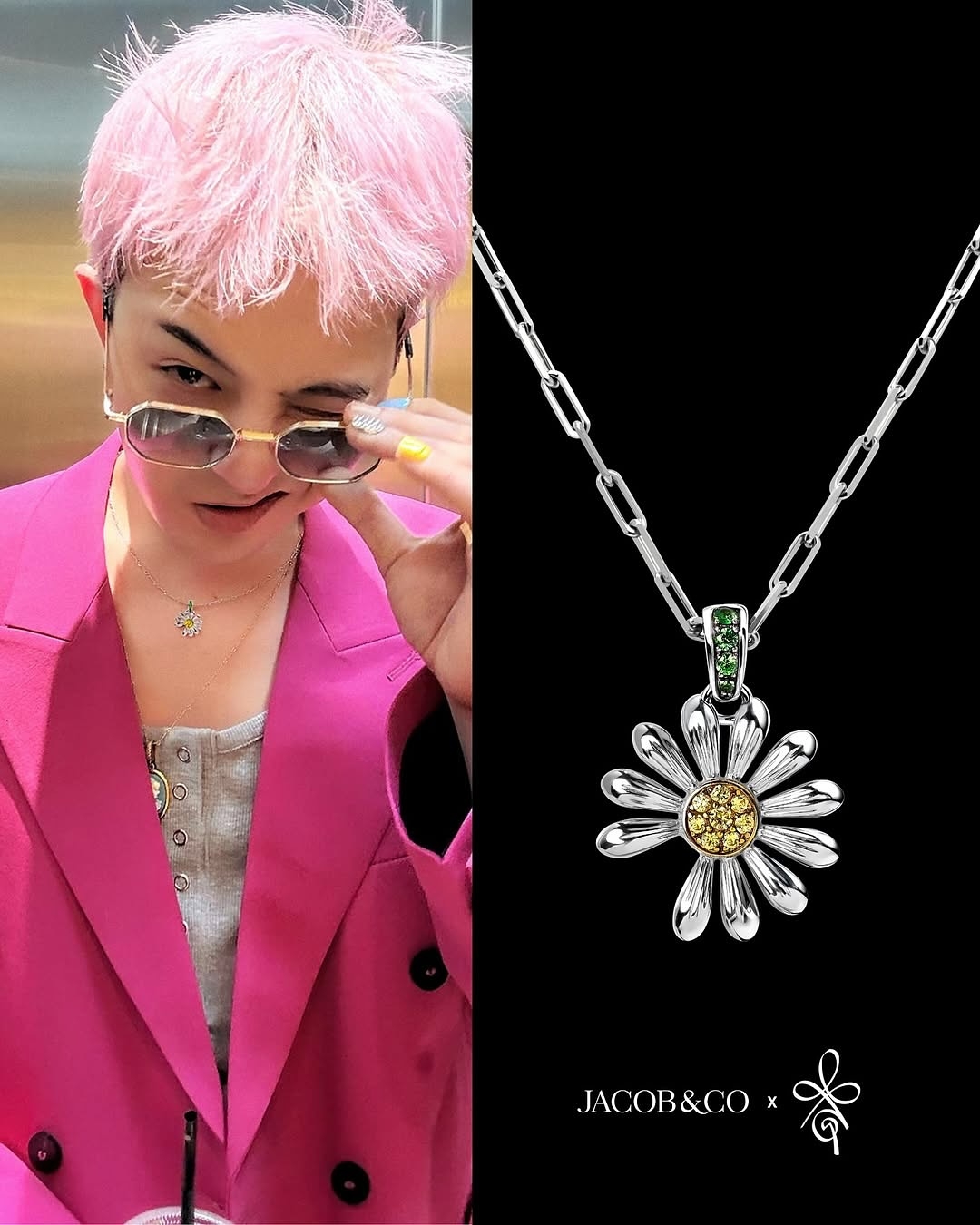 頂級珠寶 Jacob & Co. 攜手 G-Dragon 個人品牌 PEACEMINUSONE 推出聯名系列,由 GD 親自演繹形象照,標誌性粉色頭髮搭配粉色西裝、紅色印花襯衫,利用堆疊穿搭技巧打造時髦層次感,系列包含兩款「小雛菊」吊墜項鍊,以 PEACEMINUSONE 標誌性的「缺一角的花瓣」為設計概念,還配有訂製限量版包裝禮盒。