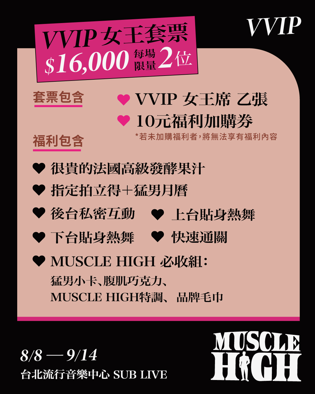 除了一般站席與坐席,每場限量2位、票價1萬6千元的「VVIP女王套票」可享6位猛男台上與台下貼身熱舞福利,甚至還能到後台互動,就是女王級待遇~另外也有「VIP大小姐套票」,福利包含快速通關、下台貼身熱舞與周邊,大小姐當起來!