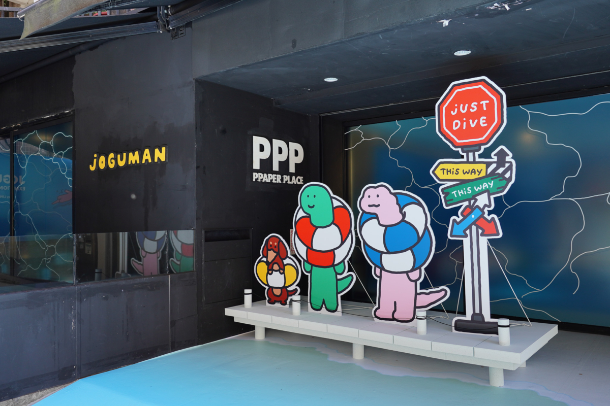 本次展覽以「GO WITH THE FLOW」為主題,打造8大打卡場景。首先在入口有可愛的恐龍BRACHIO、DIPLO與寵物臘腸狗WOODY迎接,再往裡走會看到大游泳圈、海灘、衝浪、游泳池等場景,並設立獨特的光影體驗區,粼粼的水波紋映照,與JOGUMAN一同漂浮在奇幻水世界中,每個角落都超好拍!