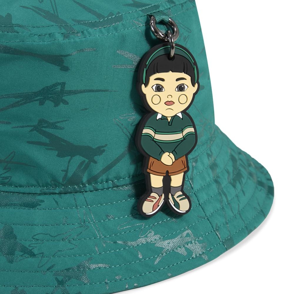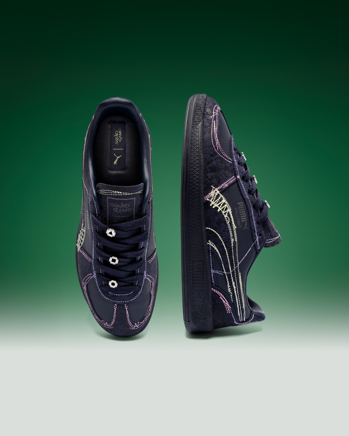 另一款聯名鞋款 Palermo SQUID GAME,則取材自緊張刺激的「廝殺捉迷藏」遊戲。鞋側的鑰匙吊飾,代表找到出口的渺茫希望;鞋墊上低調隱藏的刀子圖騰,時刻提醒玩家每一步都潛藏著危險與背叛。