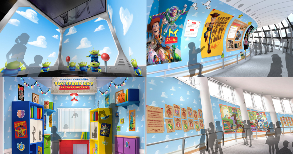 《TOY STORY SKY in TOKYO SKYTREE》展區主要位於東京晴空塔445~450層,打造6大主題佈置。首先搭乘直達電梯時會有可愛的三眼怪圍繞,抵達天空迴廊後就像來到電影中的玩具世界!包含胡迪與巴斯光年迎賓看板、玩具房間等等,還有尋找隱藏玩具的挑戰。