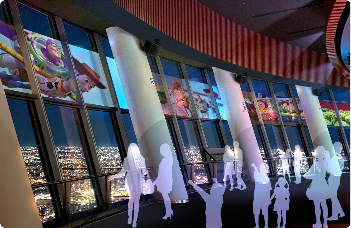而在350層的「SKYTREE ROUND THEATER」,活動期間每晚會在全景螢幕播放《玩具總動員》特別影片,每次時長約2分鐘。7月~8月於每日19:30、20:15、21:00播放;9月於18:45、19:30、20:15、21:00播放;10月於18:00、18:45、19:30、20:15、21:00播放,以官方公告為主。