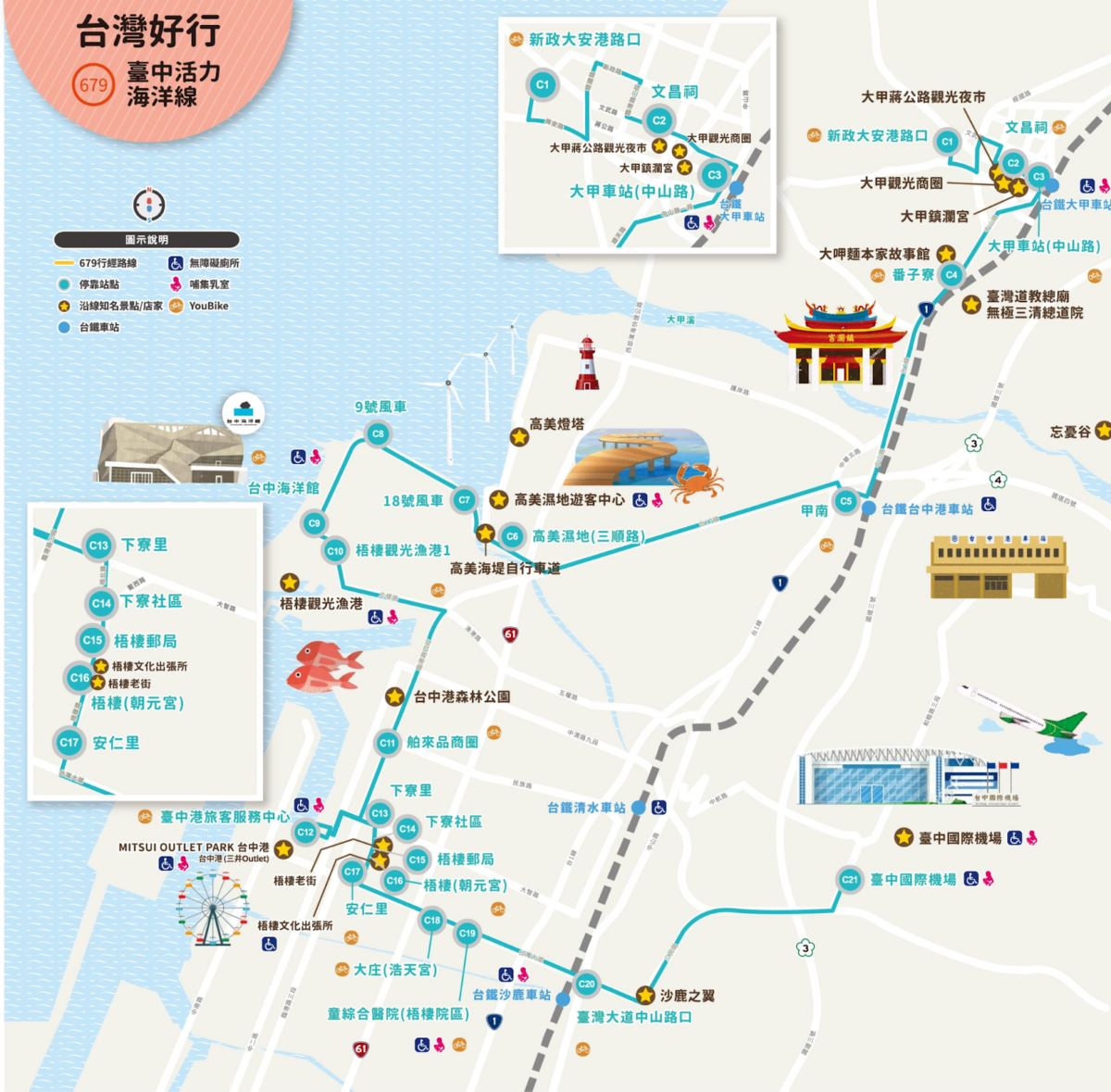 配合台中海洋館開幕,市府特別打造全長約 1.1 公里、寬 15 公尺的「海洋路」,直接連接館區與梧棲觀光漁港,目前已於 2025 年 6 月 27 日正式掛牌啟用。搭乘公車前往也很方便,更新後的「梧棲觀光漁港 1 號」站牌即為下車點,步行即可抵達館區。