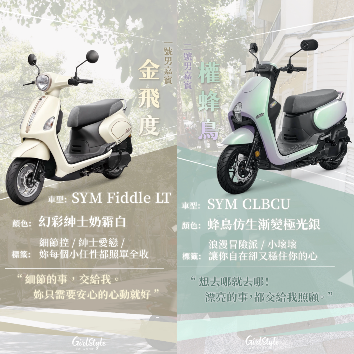 每個女孩的戀愛啟程,都少不了那種青澀又甜膩的悸動感><就像戀愛實境秀裡,那些令人小鹿亂撞的曖昧瞬間(笑)。就像妳在選人生第一台車時,也會興奮到心跳加速!SYM 這次以兩款車【Fiddle LT優雅細節奶霜白】與【CLBCU 蜂鳥仿生漸層極光銀】,化身兩位風格截然不同的「戀愛對象」,將陪妳一起演一場屬於自己的戀愛大作戰!讓新手選車不再是難題,只要選對人(車),從此出門天天都像在約會♡