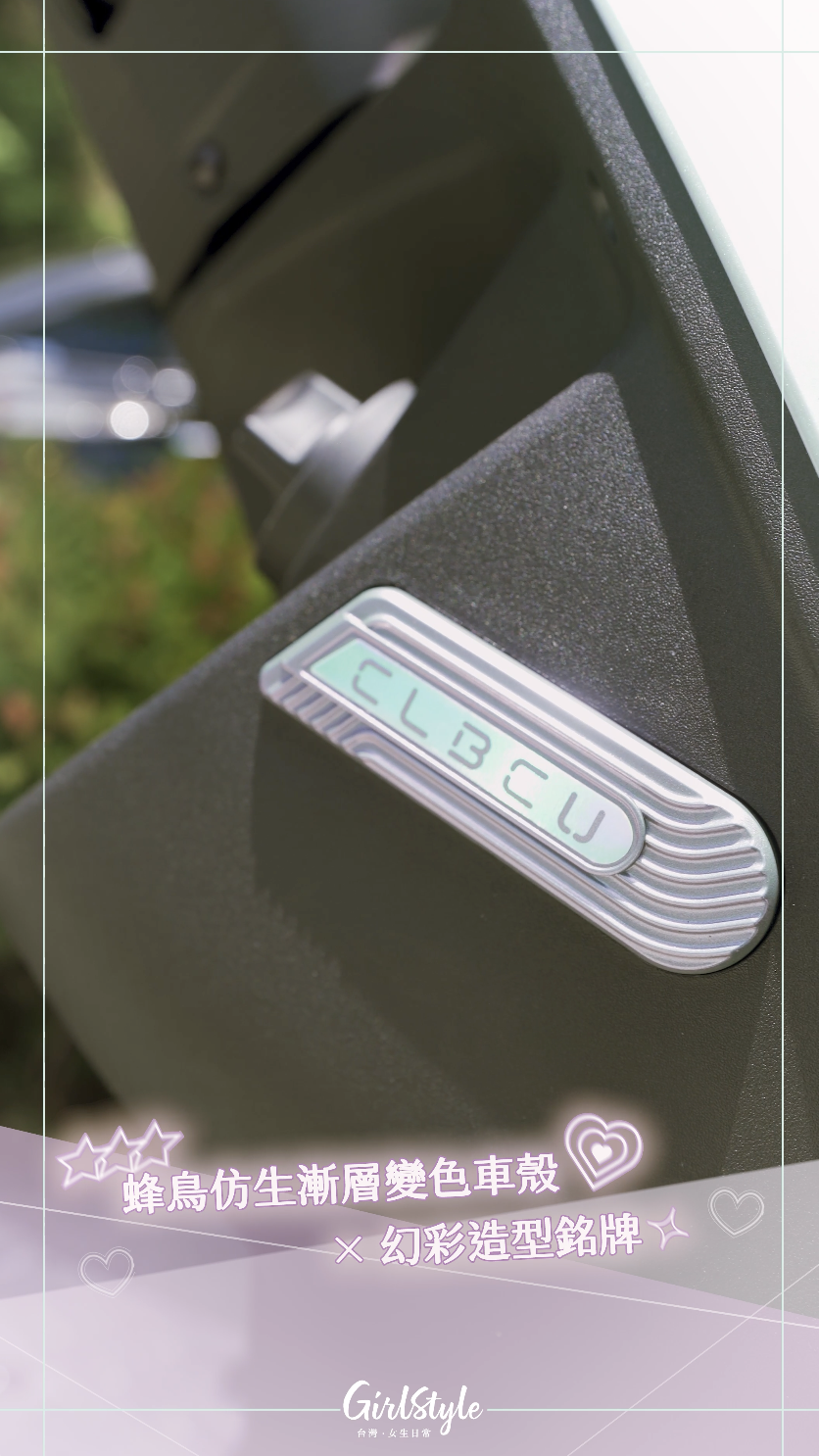 它的外型可以說是天生的心動製造機,車身採用蜂鳥仿生設計的漸層變色烤漆,在陽光下流動著宛如羽翼的光澤,每個角度都有不一樣的迷人色調;搭配幻彩造型銘牌點綴在車側,像是它衣領間若隱若現的小巧配件,讓人忍不住再多看一眼~