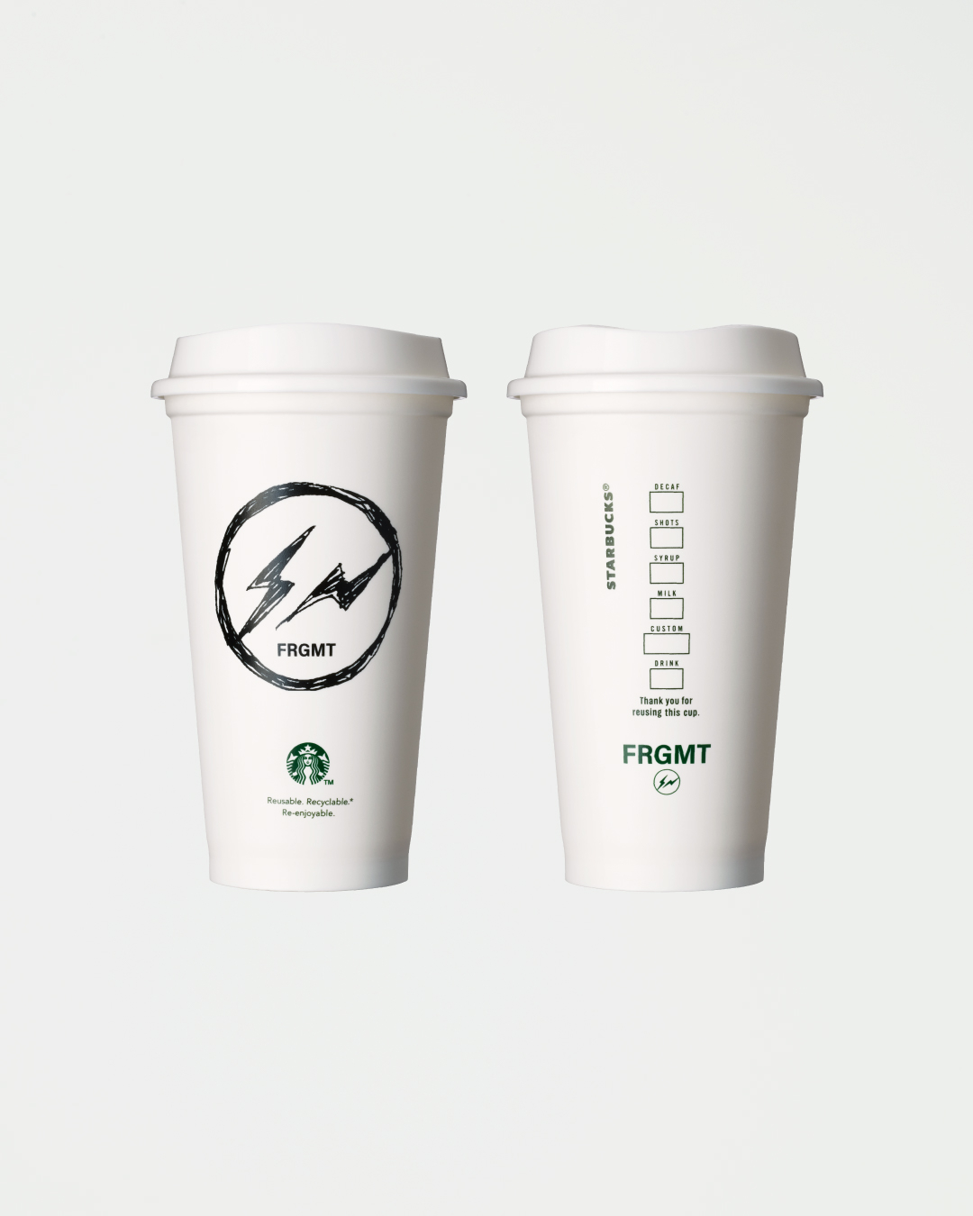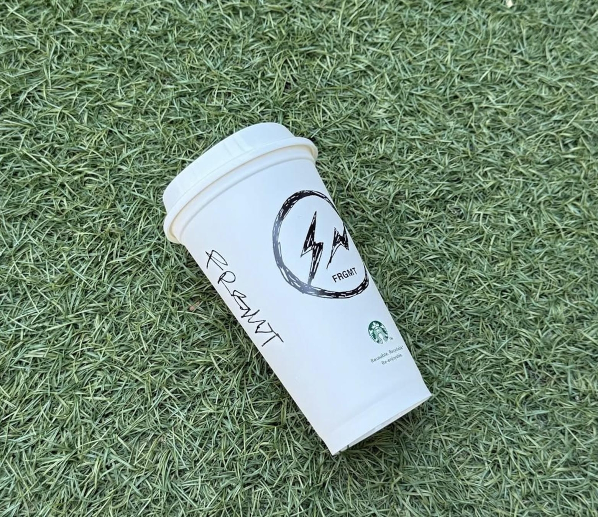 不只聯名飲品,這次同步推出的 FRGMT MYST 聯名外帶杯也勢必成為潮人必備單品。外帶售價日幣905元,杯身印上 fragment 經典閃電徽章及「FRGMT」字樣,低調又有辨識度,簡約設計超適合日常搭配,拿在手上潮感爆棚。」