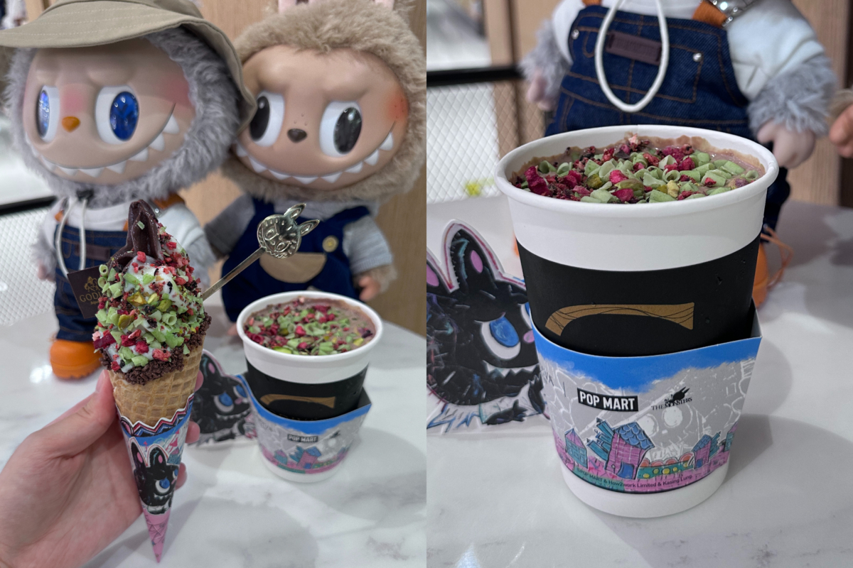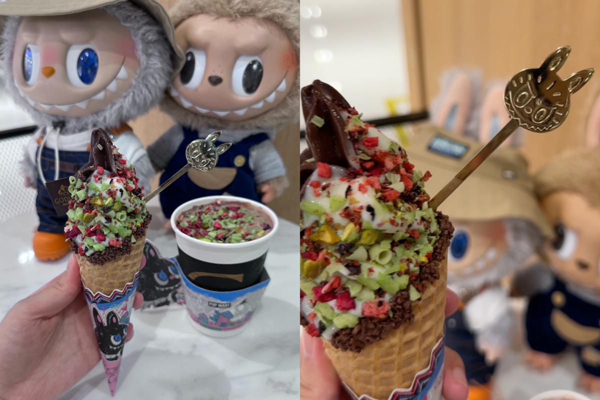 當 LABUBU 踏進 GODIVA 的巧克力國度,絲滑可可如河流鋪陳,綿密霜淇淋堆疊成翠綠起伏的山丘,鮮紅莓果點亮冒險的火光——每一口都是角色與場景的投射。首波限定一次帶來 3 款霜淇淋 + 2 款奶昔: