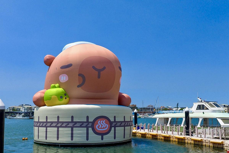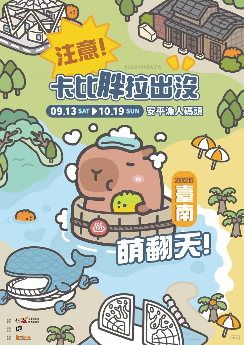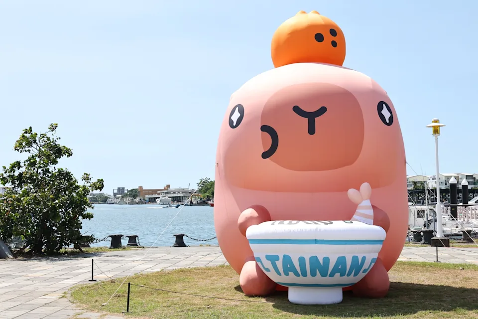 台南觀旅局與台灣原創IP「卡比胖拉」首度合作,打造為期逾一個月的「2025卡比胖拉出沒注意!臺南萌翻天」活動,即日起至10/19登場安平區漁人碼頭。最大亮點高12米的「慢活湯柑」水上氣偶,卡比胖拉泡湯的造型療癒十足,手還抱著台南秋冬的在地特產青皮椪柑。