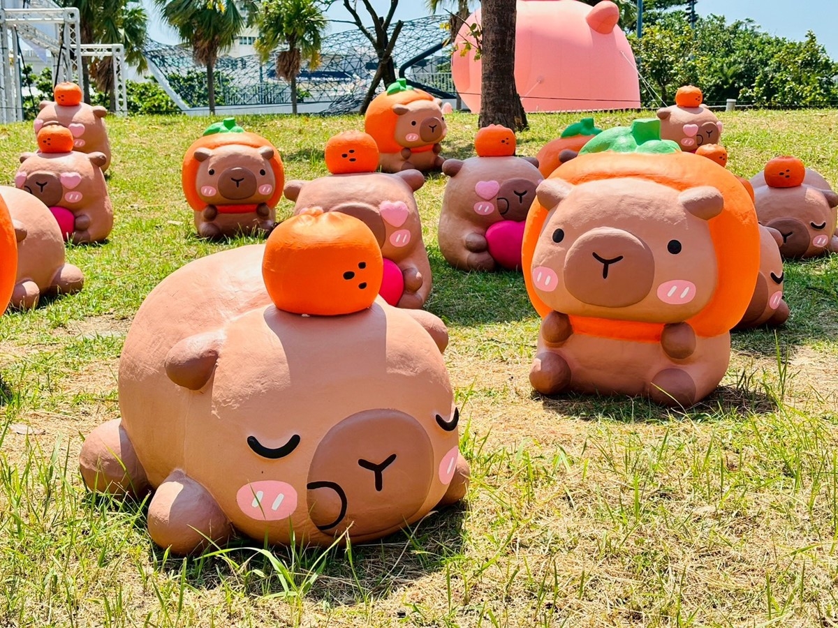 除了水上氣偶,還有2隻5米高的卡比胖拉登陸!「芒果午憩」頭上頂著在地名產愛文芒果,手拿卡比胖拉最愛的橘子;「滿福擔仔」則是捧著台南小吃擔仔麵。另一處更聚集了50隻紙雕卡比胖拉,有「柑橘小精靈」、「戀戀臺南味」、「甜夢橘眠」3款造型,超級可愛!