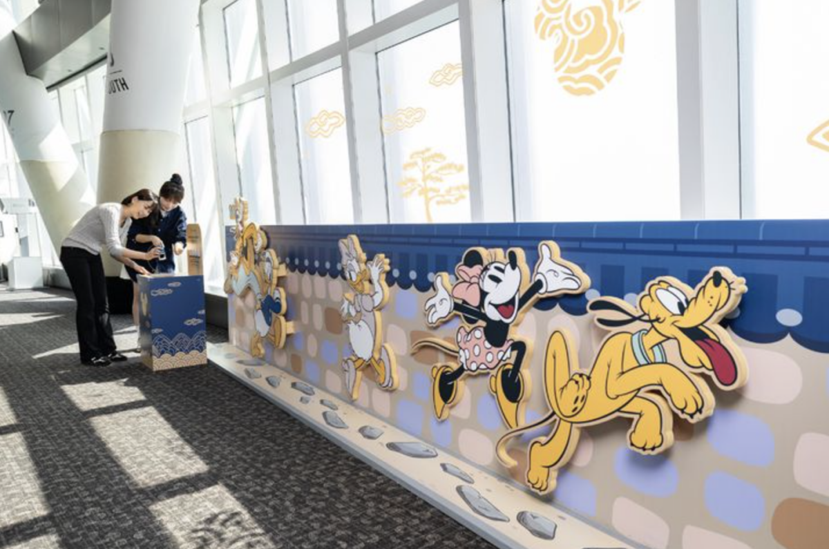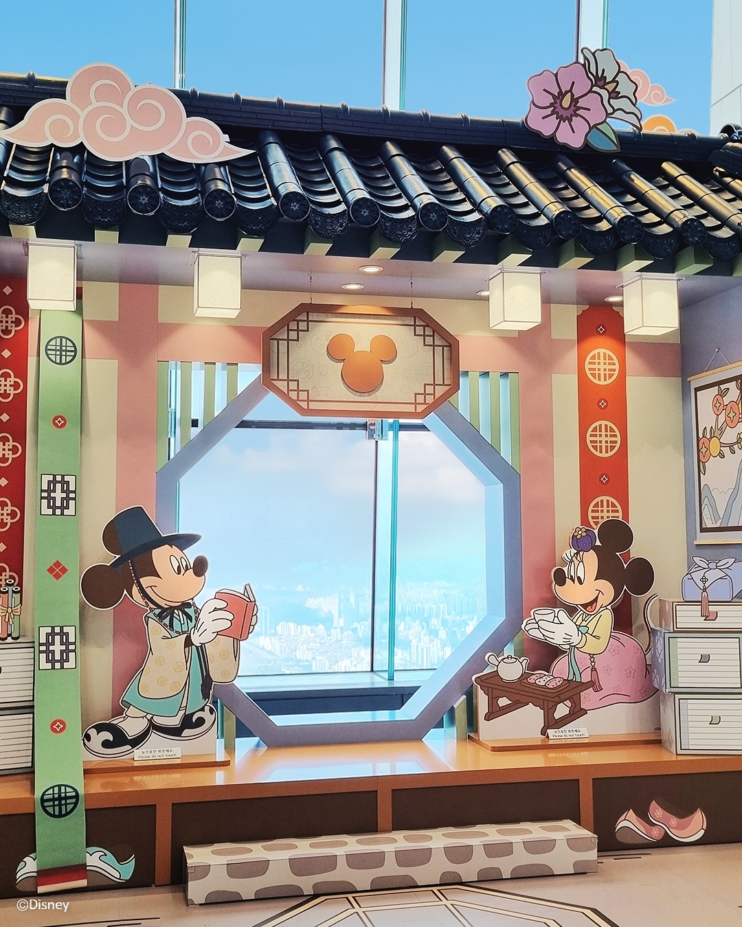 體驗最具韓味的迪士尼時刻,一定不能錯過 121 樓的「Mickey and Friends 韓屋體驗區」。這裡以傳統瓦房與韓服造景打造,米奇、米妮與朋友們穿上韓服現身。此外,全場設有「Stamp Tour」集章活動,從 B2 到高空觀景台共四個點,集滿印章就能兌換限定貼紙或小禮物,讓整趟旅程更有成就感。