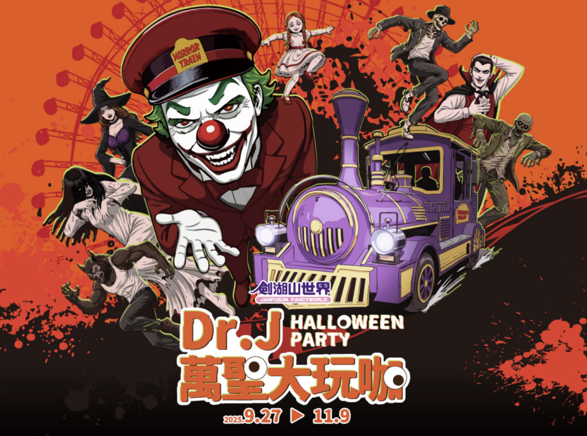 小丑列車長Dr.J再度現身劍湖山!2025年的「Dr.J 萬聖大玩咖」除了在園區內規劃多個鬼怪主題場景等著大家踩點,活動期間也有集結國際頂尖特技團隊的愛遊世界奇遇記、驚險的恐龍見面會,甚至在驚嚇列車場景內還以8節列車車廂改造成實驗場地,帶來沉浸式的驚嚇體驗。趕快帶著你的熱血與勇氣,以及最可愛、最恐怖的裝扮加入Dr.J的狂歡行列,一起展開這場極限的生存歷險記!