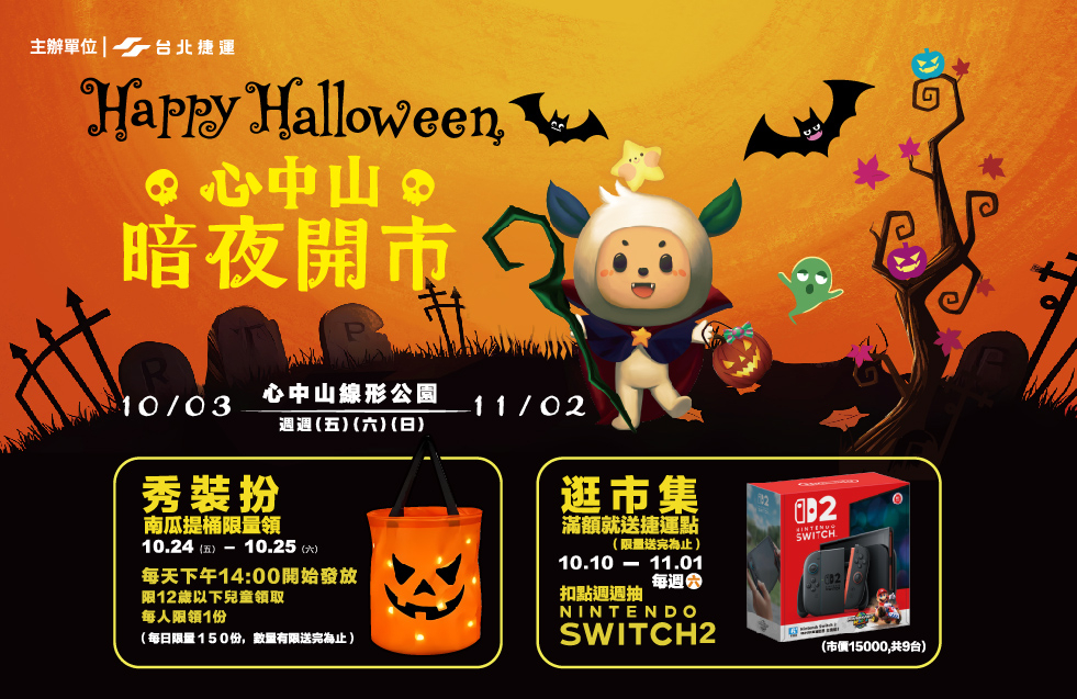 文化潮流集聚地的心中山線形公園每年皆會舉辦萬聖節相關活動,而台北捷運公司與有趣市集共同主辦的「心中山 哈囉鬼派對」已邁入第2屆,即日起至10月底現場將化身萬聖市集,多元攤位集結手作甜點、特色餐車與特調飲品,營造濃厚的歡樂氣氛,同時包含獵奇小物、文創選品與變裝道具,更有吸睛的4米高捷米造型氣球登場,在逛街之餘也能滿足造訪民眾吃喝玩樂與打卡需求。