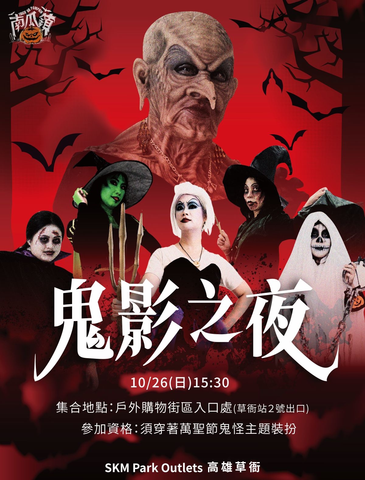SKM Park 將萬聖夜定在 10/26 舉辦「鬼影之夜」遊行,活動氣氛偏向年輕、潮流、夜間派對式。 活動範圍包含大型恐怖場景打卡、裝扮遊行、現場拍照抽獎或裝置互動,適合晚間與朋友同行。夜間戶外商圈及購物中心結合萬聖節主題,是年輕人拍照打卡、社群經營的熱門場景。建議穿著顯眼或有主題感的裝扮(或踩街服裝)以融入活動氛圍,也可提前關注商圈粉專祥細活動時間。由於為夜間活動,交通與停車建議提早到場,並注意夜間安全及同行人數。