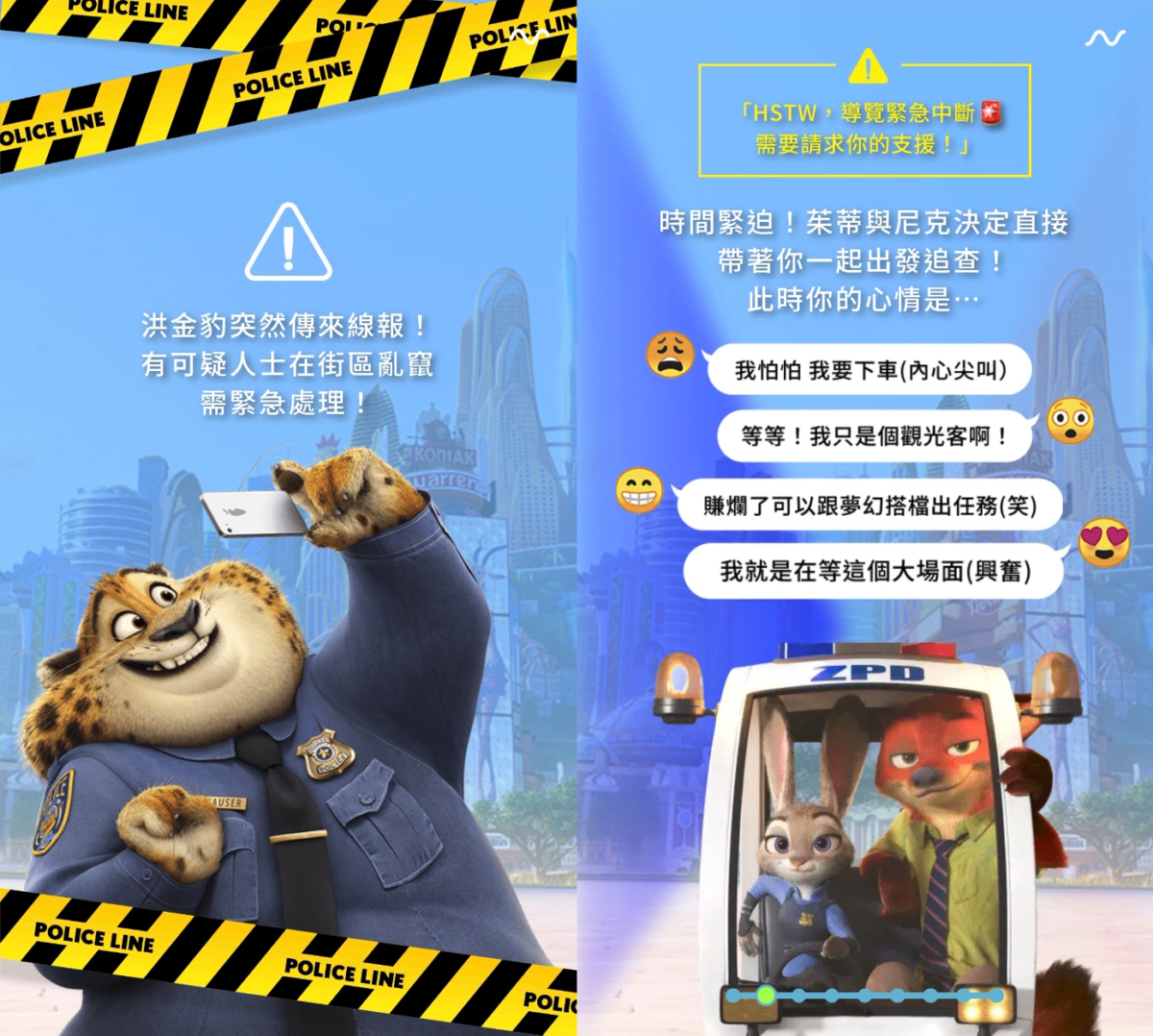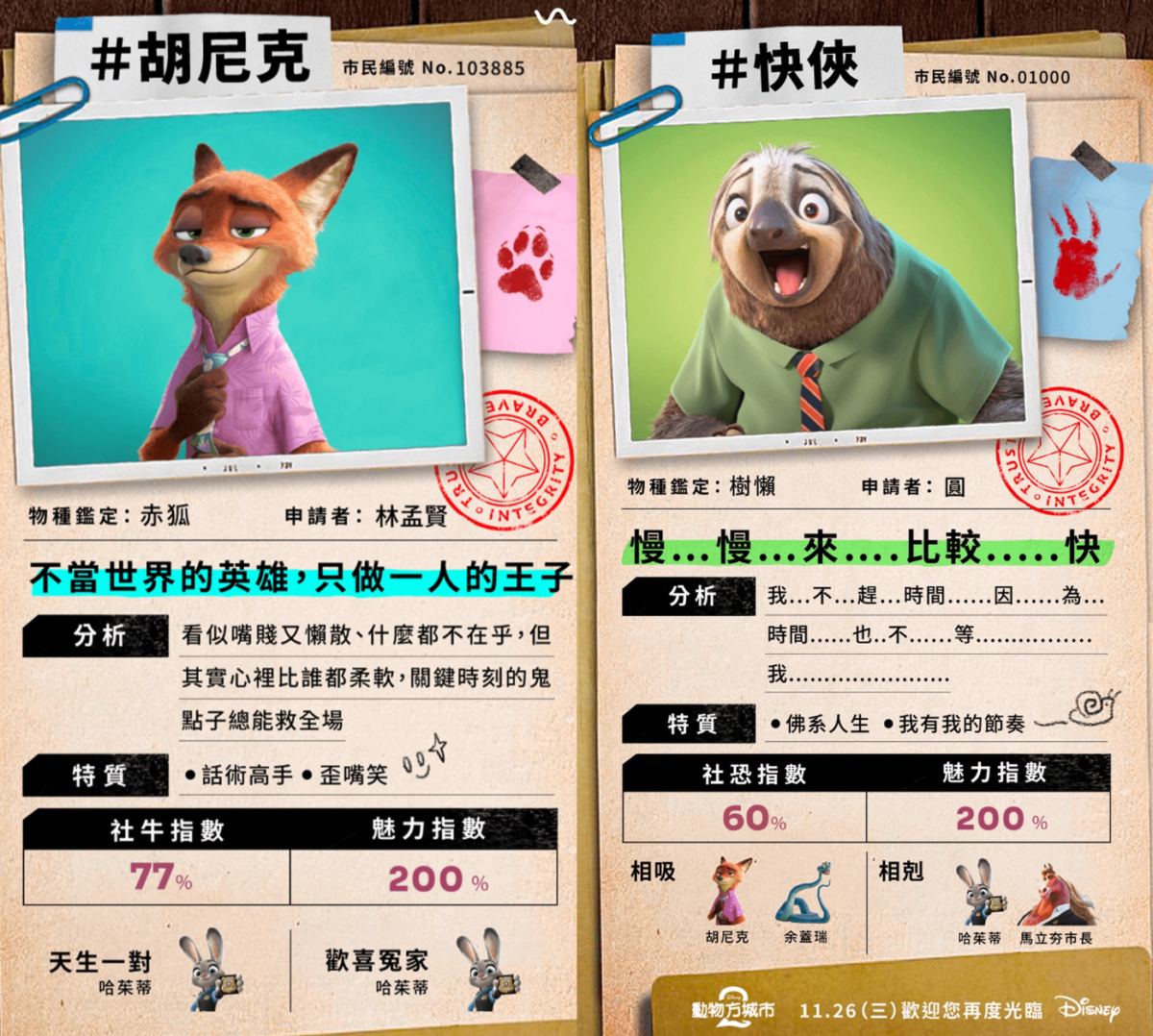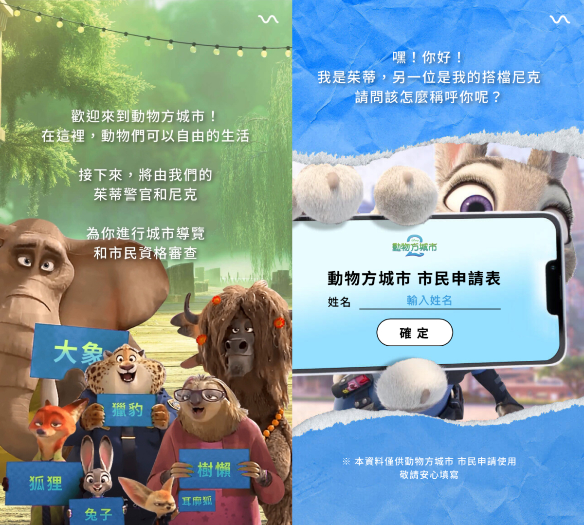 夢幻的動物方城市首次開放市民申請,輸入自己的名字後,便開始與茱蒂、尼克展開一連串的冒險,調查才能成功通過動物身份鑒定,測出你在動物方城市中是什麼角色!推薦大家測驗時記得開聲音,搭配超用心的情境式動畫,就像真的踏進動物方城市~
