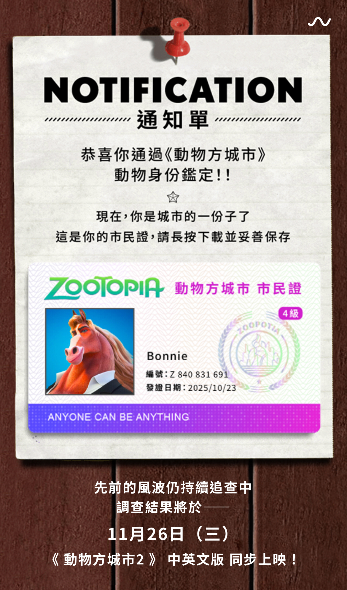 事件圓滿落幕後,獲得茱蒂與尼克的認可。即將道別時,還一起拍了張紀念照,按下快門鍵即產生測驗結果、市民證通知單!動物身分角色包含:志羚姐姐、快俠、胡尼克、馬力夯市長等等,甚至搭上近期迷因「從從容容,游刃有餘」超級幽默~