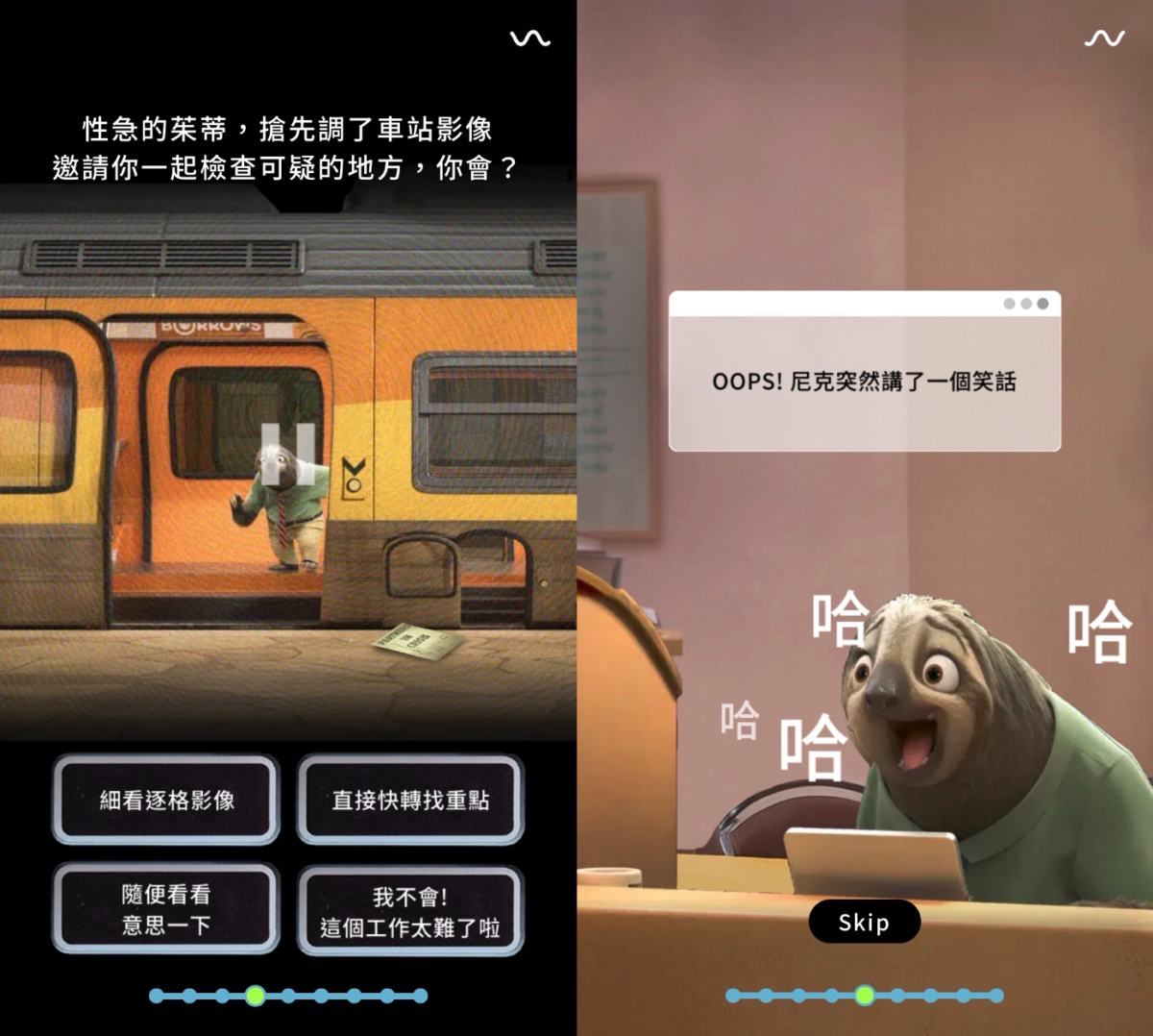 經過了播著新聞的電視牆,性急的茱蒂搶先調查可疑的車站影像。接著尼克又建議去找快俠詢問線索,尼克突然講了一個笑話,快俠「哈…哈..哈…」笑得非常慢,真實還原電影中的場景!