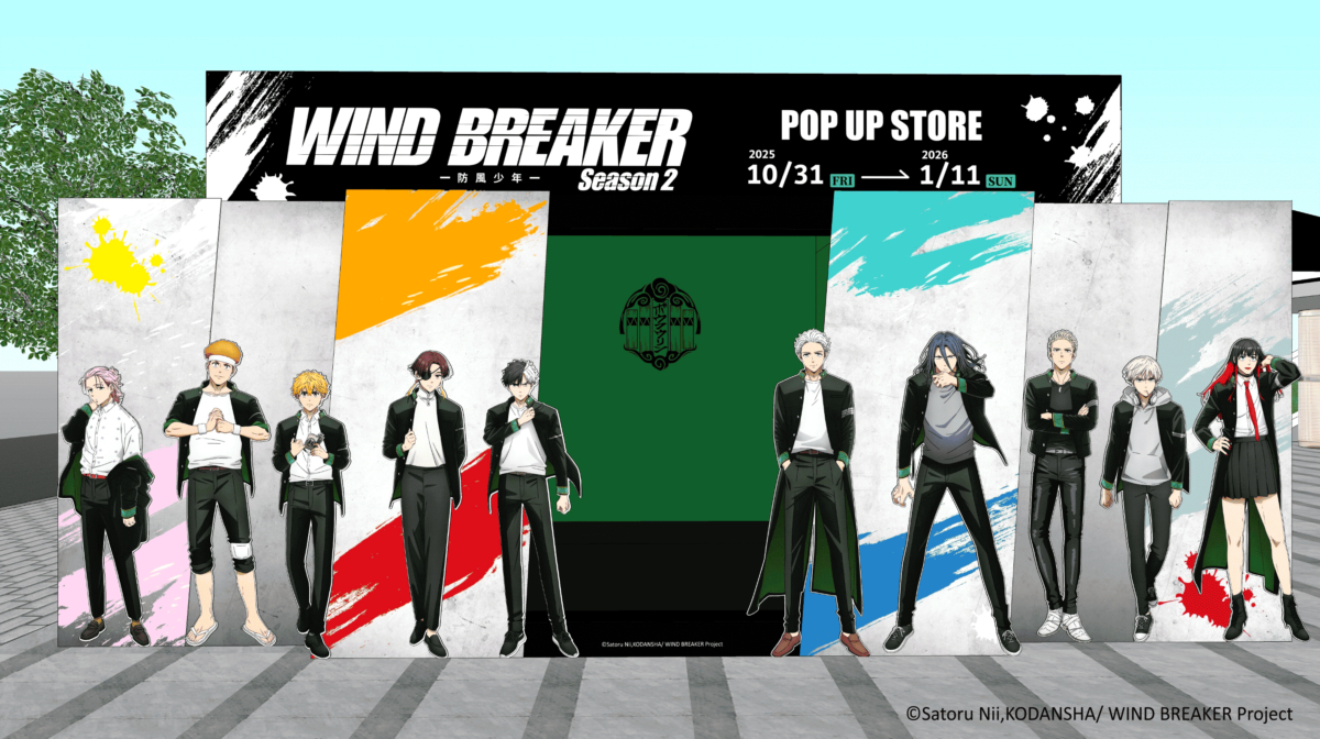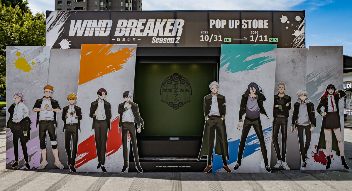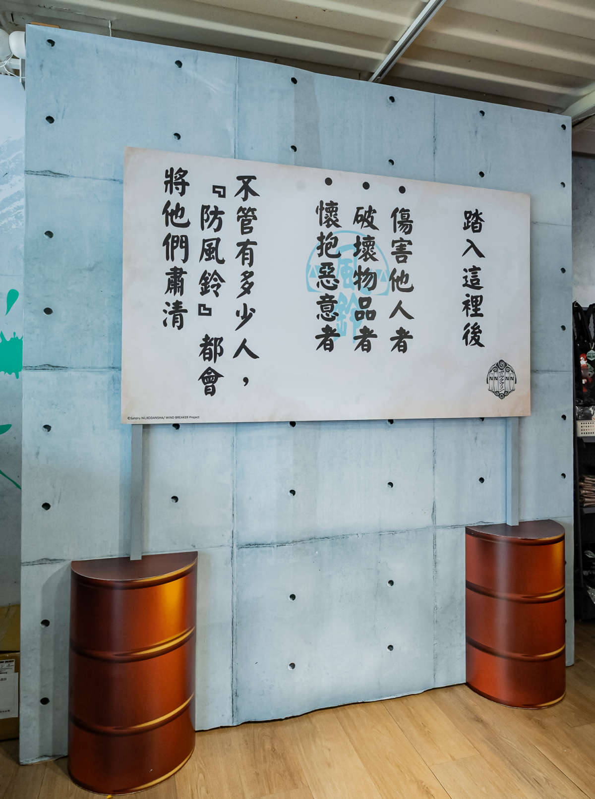 「防風鈴」集合!一到現場先被防風少年主視覺帥到,必拍角色等比例主角牆、便服街頭區…等打卡點。並帶來超過50款全新週邊,包含無框畫、掛軸冷水壺、旅充等限定商品,都是鐵粉必敗!