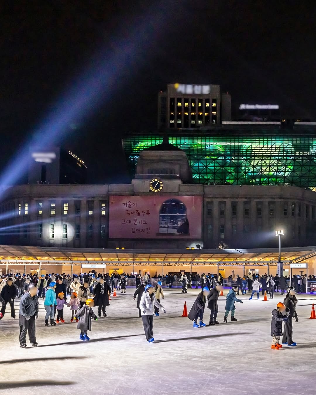 首爾市廳前的 Seoul Plaza 是冬季最具代表性的打卡地,每年都會打造臨時冰場,成為當地人與觀光客最愛的冬季活動。今年也不例外,首爾市府將廣場變成「千元幸福溜冰場」,不僅維持親民票價,還規劃了節慶表演、聖誕裝飾與安全防護措施,讓大小朋友都能安心享受滑冰樂趣。