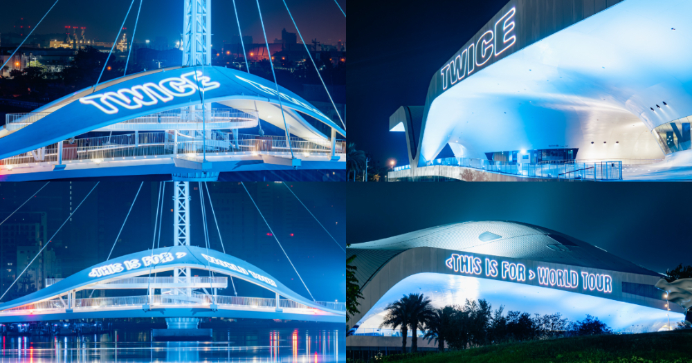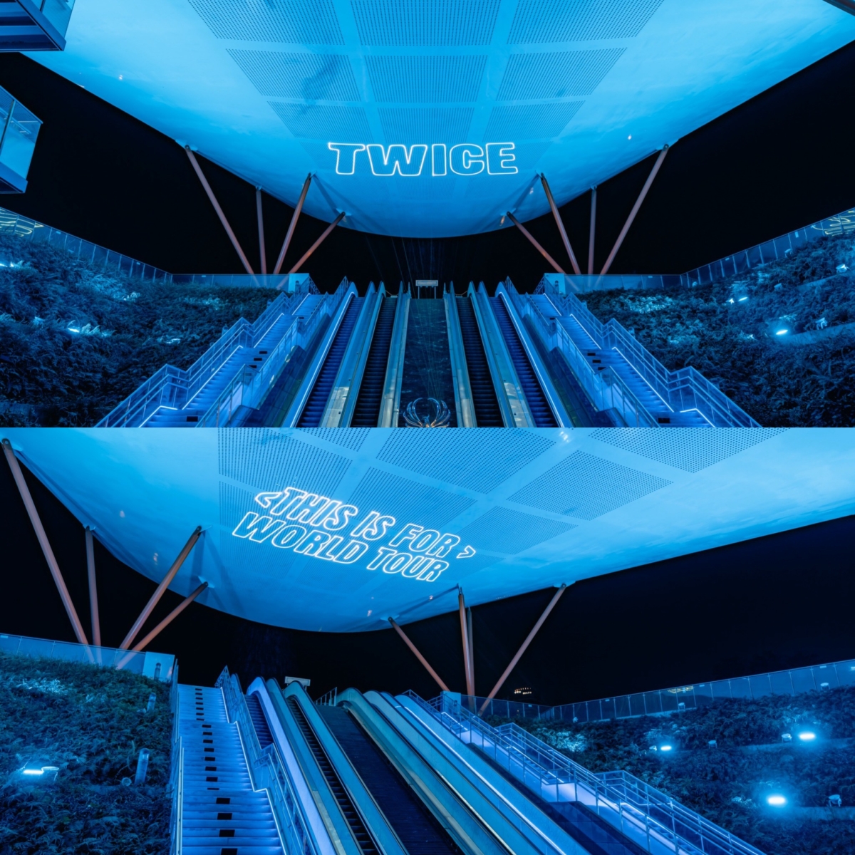終結10年等待!TWICE<THIS IS FOR>WORLD TOUR IN KAOHSIUNG於11/22、11/23登場世運主場館,高雄7大地標「大港橋、衛武營國家藝術文化中心、中央公園捷運站1號出口、高雄流行音樂中心、愛河、高雄港旅運中心、美麗島捷運站」點亮巡迴視覺藍燈光,甚至還有雷射文字。
