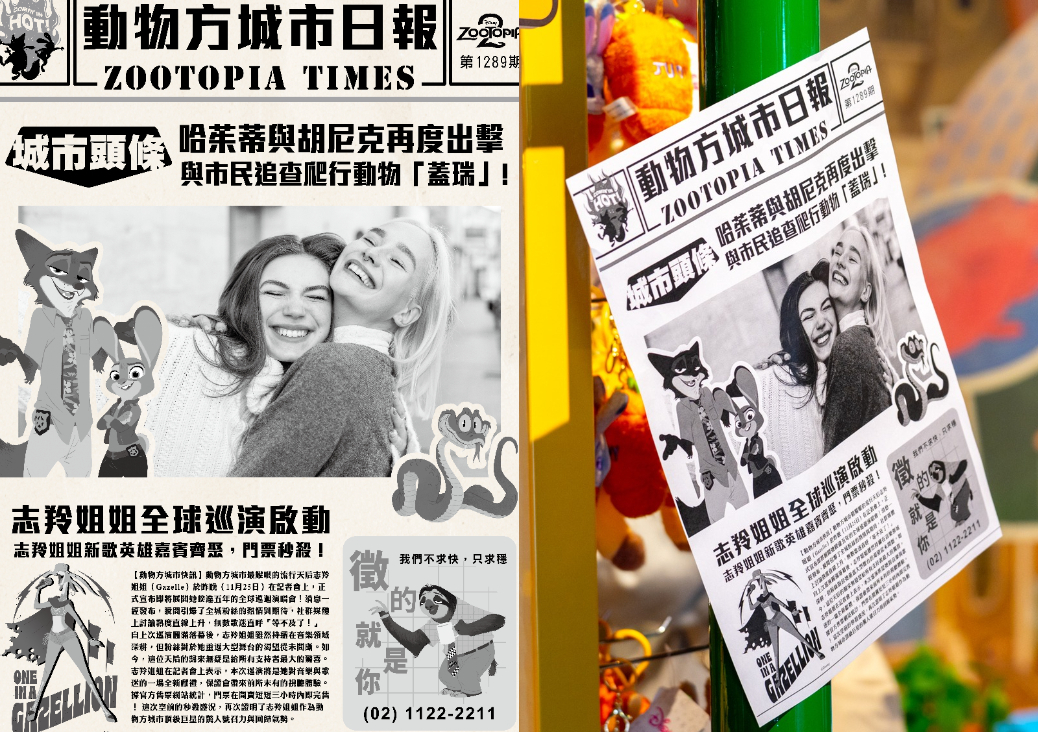 頭版人物注意!現場設有近年非常流行的拍貼機,為A3尺寸的真實報紙造型樣式,與茱蒂、尼克兩位主角一同登上「動物方城市日報」城市頭條。有趣的是,報紙上同樣有滿滿細節,印著神秘動物調查、志羚姐姐全球巡演、樹懶徵才公告,都是動物方城市最新發生的大事件~