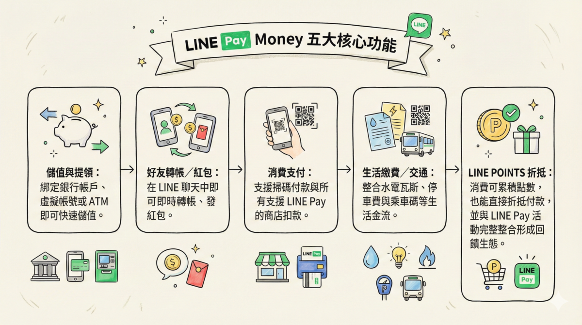 LINE Pay Money 是由 LINE 自行營運的電子錢包帳戶,提供儲值後用於線上與實體商店付款、好友間即時轉帳、生活帳單繳費、交通服務支付等功能。與過去需依賴 iPASS MONEY 作為後端不同,全新的 LINE Pay Money 完整整合所有金流流程,由 LINE 自行管理並提供更一體化的使用體驗,也不需額外下載APP,一切都在Line上就能搞定。