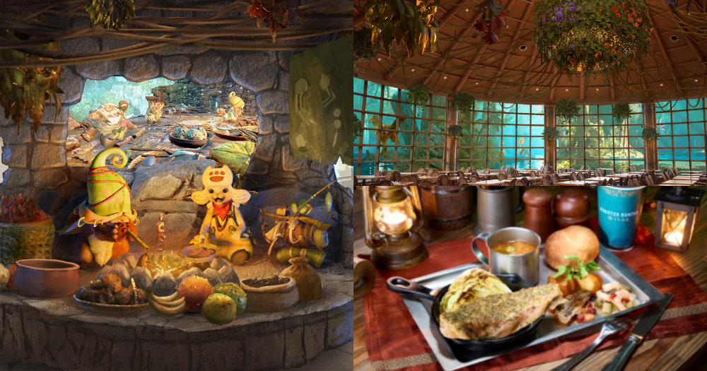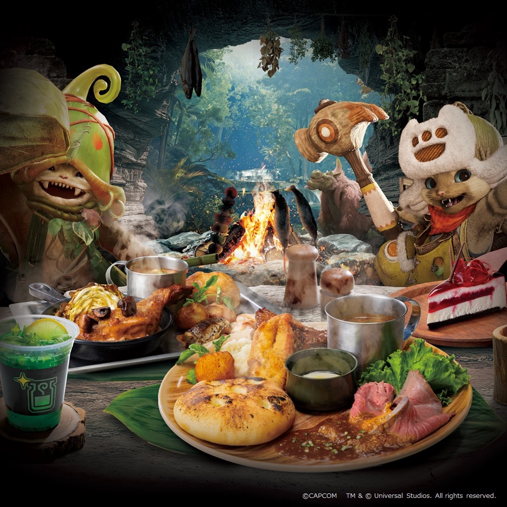 位於侏羅紀園區的LOST WORLD餐廳,首次以《魔物獵人荒野》遊戲世界觀為主題,邀請大家蒞臨熱鬧且大名鼎鼎的「莫利巴宴會」,餐廳內充滿緋紅森林元素佈景,提供香烤豬肉、雞肉咖哩等令人垂涎三尺的營火料理,享受莫利巴的熱情招待!