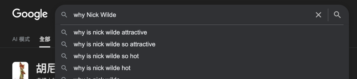且只要你上網用英文搜尋「Why Nick Wilde…」,跳出來的全部都是:為什麼胡尼克這麼受歡迎?為什麼胡尼克這麼性感?網友的瘋狂程度直接寫在搜尋結果上,也難怪大家都說,胡尼克的魅力是全球公認、無法抵抗的!