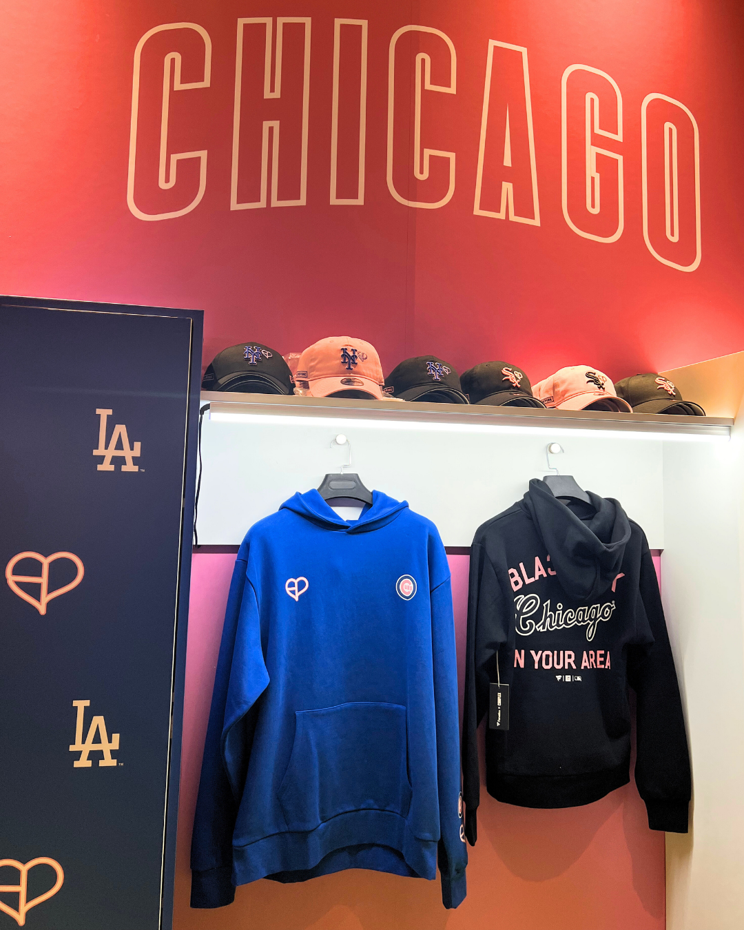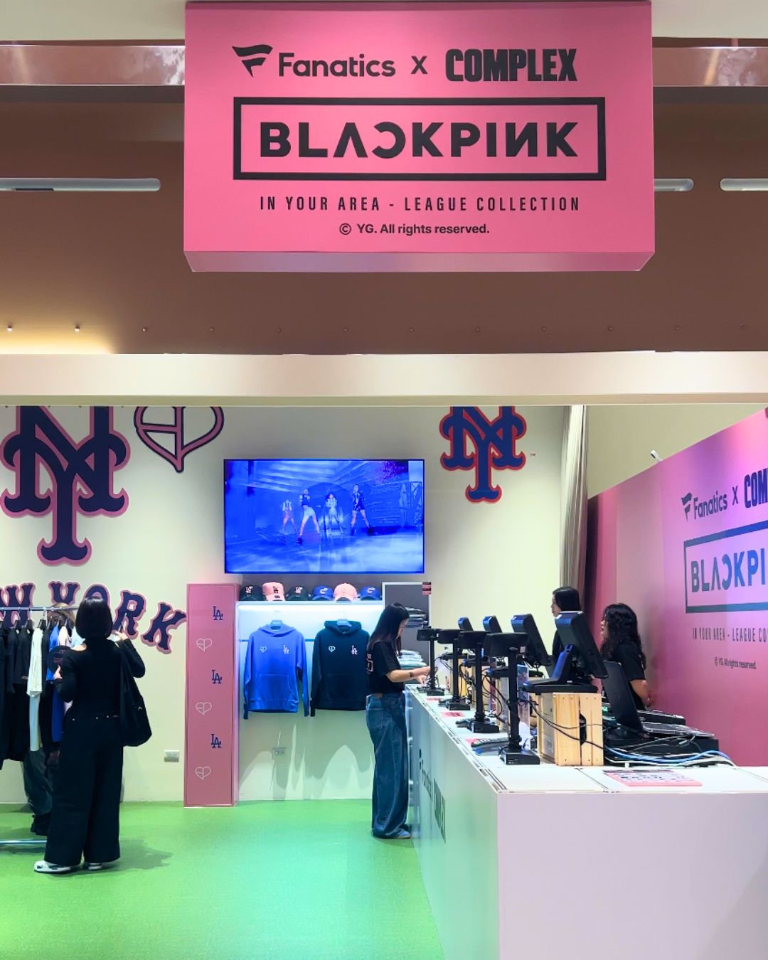 這次快閃店由Fanatics、Complex與BLACKPINK三方聯手打造,店內以經典粉黑配色為主要設計,並結合New Era、美國職棒大聯盟(MLB)、法國足球豪門巴黎聖日耳曼(PSG)的限量聯名單品整齊陳列,從主題打卡背板到創意牆面皆充滿粉黑元素,就是要告訴大家「BLACKPINK IN YOUR AREA!」