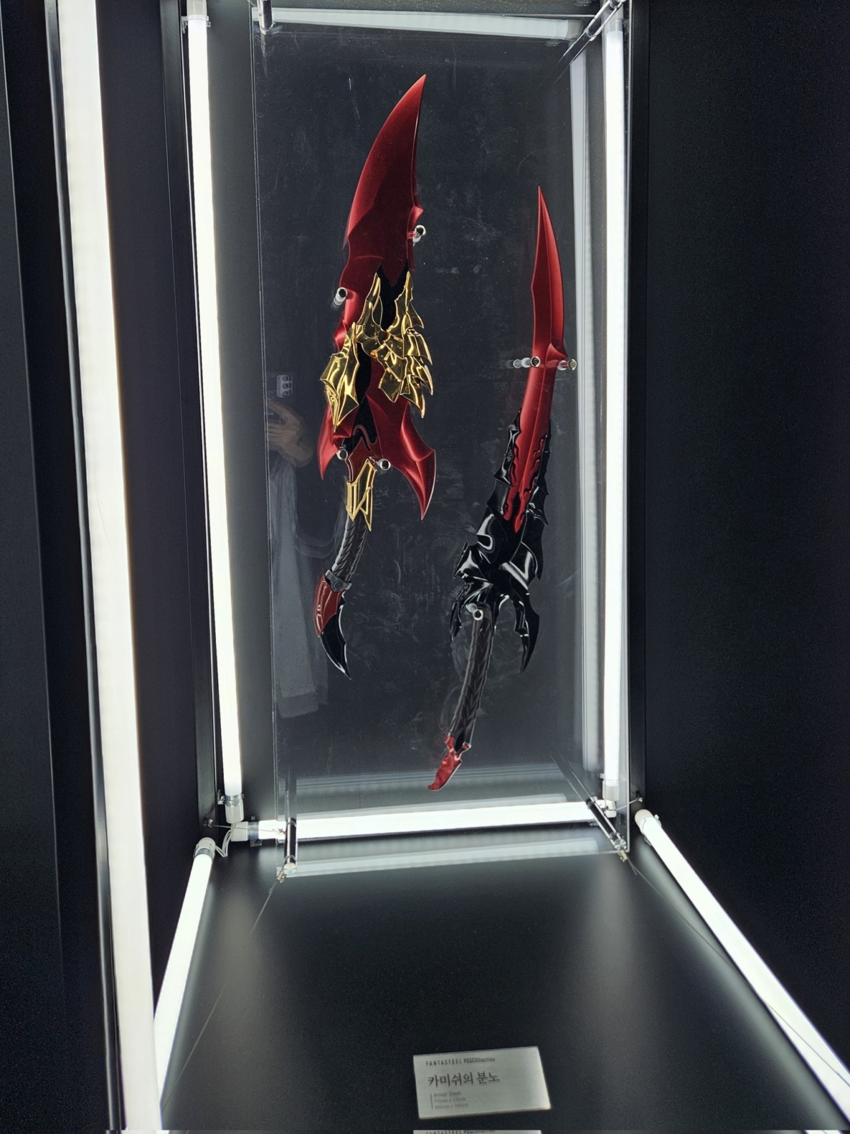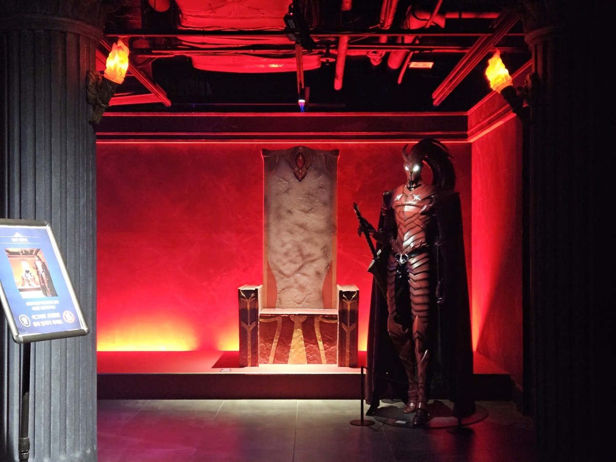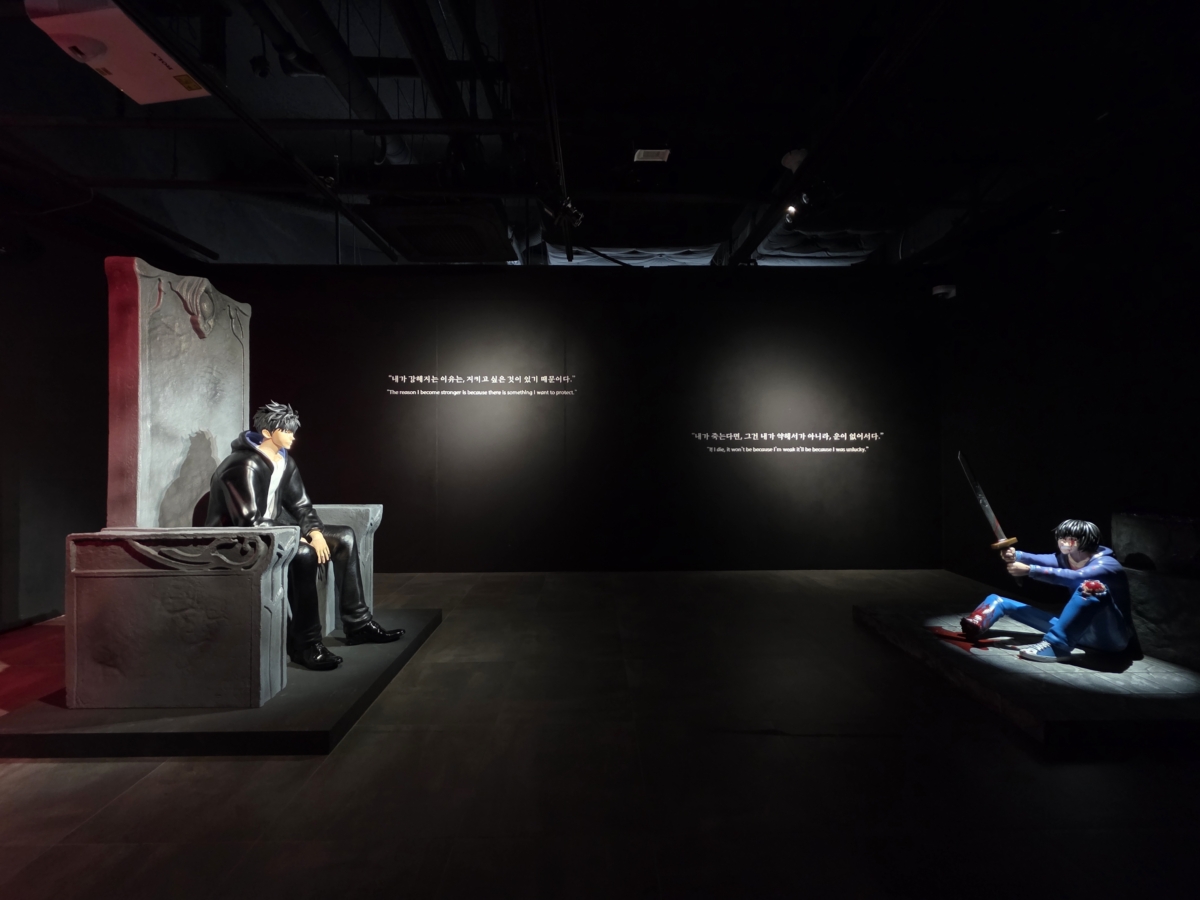 提到《我獨自升級》的關鍵名場面,就不能不提成振宇命運轉折的「卡特農神廟」。展覽中完整重現這個經典場景,巨大的石像、詭異的微笑表情,加上刻意壓低的光線與背景音效,一走進去就能感受到強烈的不安與壓迫感,那種被「規則支配」的氛圍,幾乎與動畫如出一轍。除此之外,包含弘大地鐵站下方的神秘洞窟、濟州島強奪戰等重要戰役,也都透過展覽與視覺演出忠實呈現,讓粉絲重新回味每一場關鍵戰鬥。