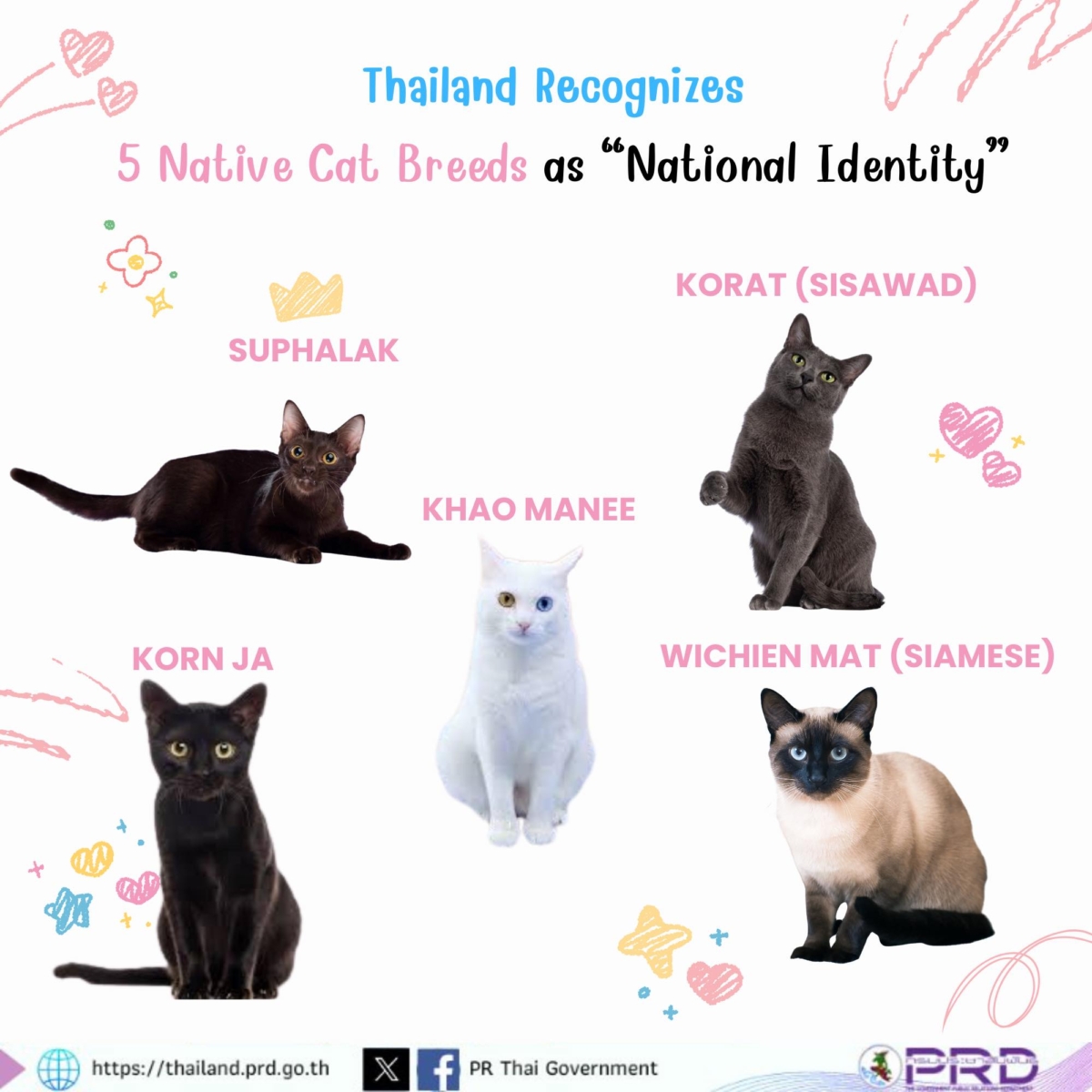 不只是陪伴人類的寵物,在泰國的古老文獻、宗教與民間信仰中,貓都被賦予重要的象徵意義,就連皇室都視若珍寶。然而隨著時代的演變,部分的原生貓種面臨混種與消失危機,甚至有外國組織試圖搶先註冊純種泰國貓。因此泰國將5大貓咪品種列為國家代表動物,包含:素帕拉克貓、暹羅貓、白瑪瑙貓、呵叻貓、貢扎貓。