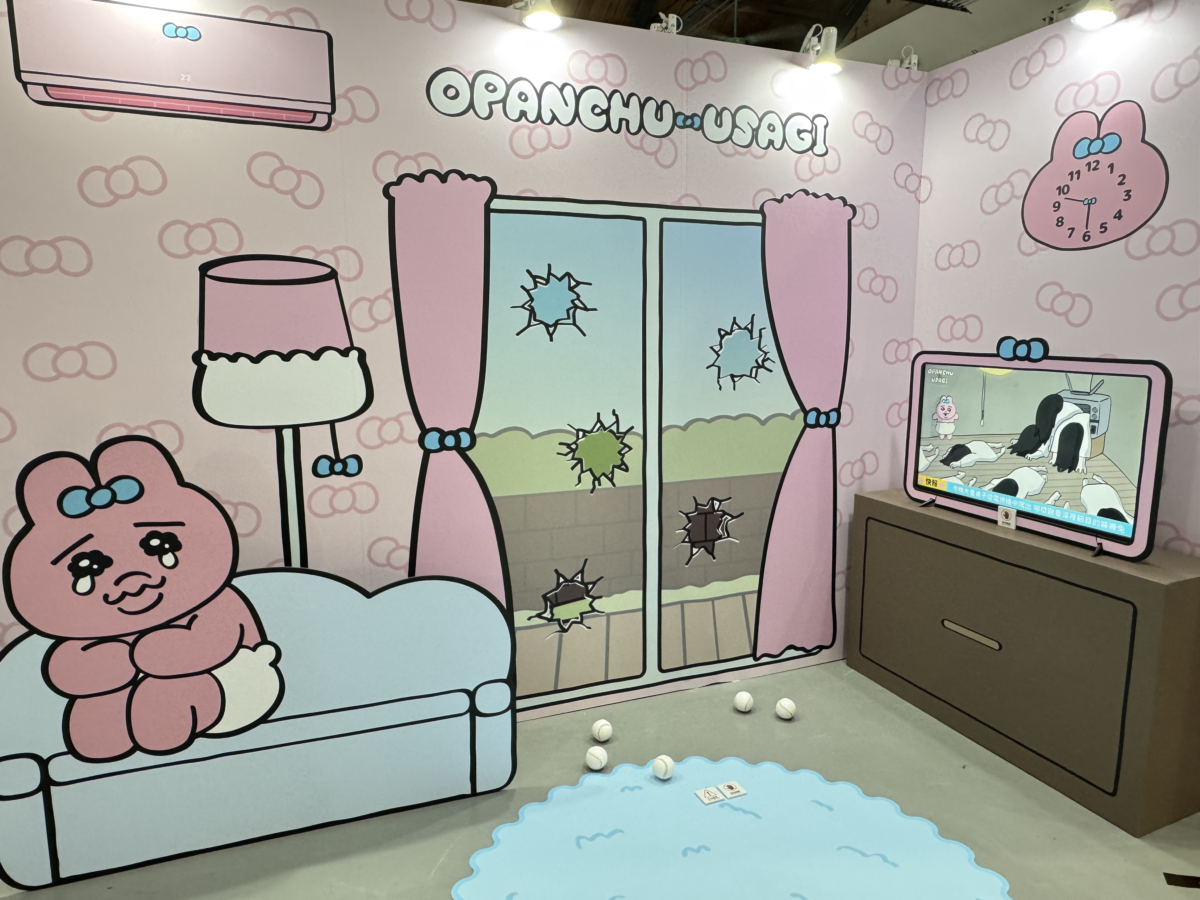 本次快閃店以「褲褲兔的日常生活」為主題,打造多個沉浸式拍照場景。從褲褲兔的專屬空間、被棒球砸破的窗戶、委屈縮在沙發上的模樣,到陽台晾著小褲褲的畫面,都完整重現漫畫中那種「可憐又可愛」的經典日常,讓人一走進去就忍不住拍個不停。