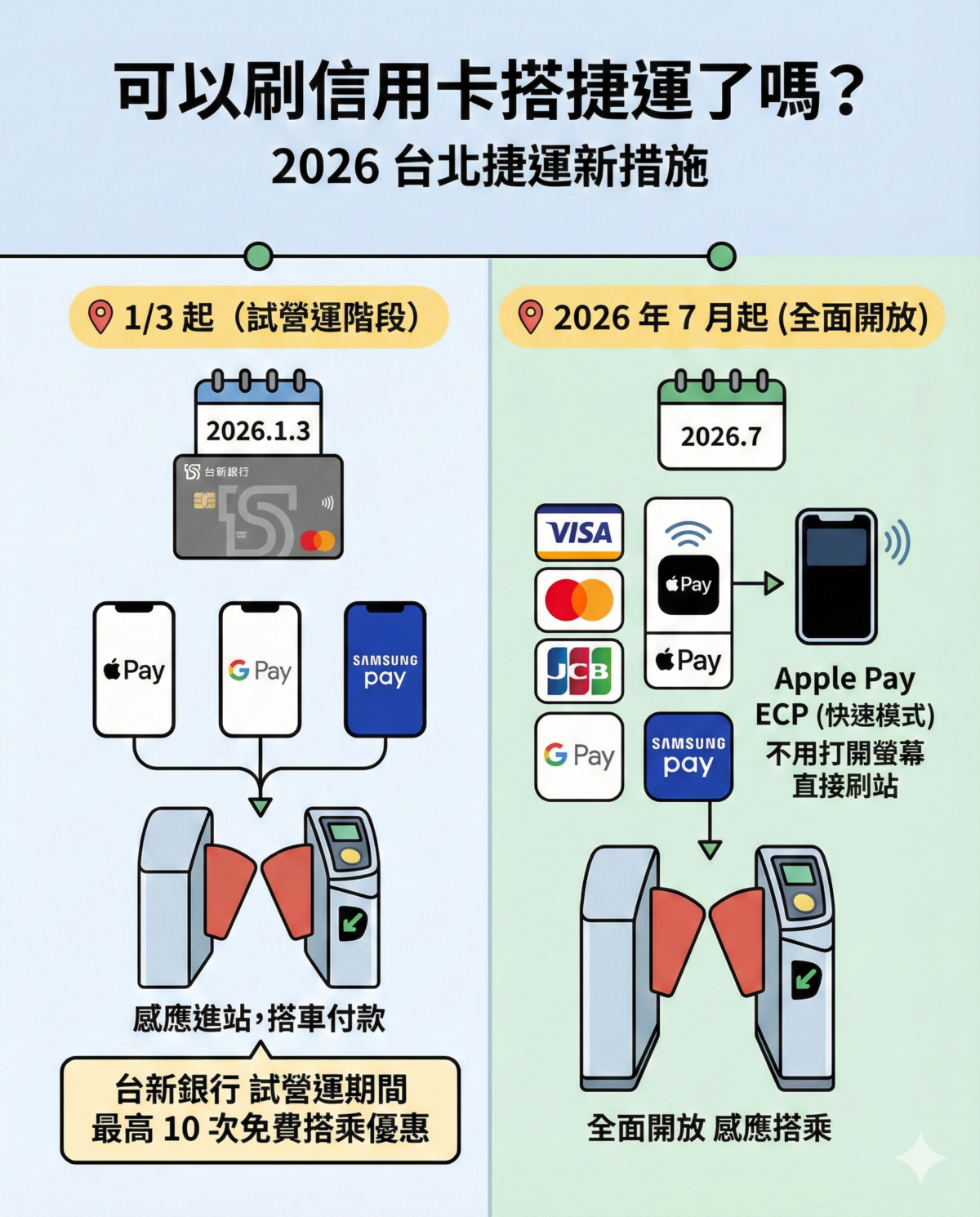 自 2026 年 1 月 3 日 起,台新銀行信用卡可率先在捷運閘門 感應進站、搭車付款,包含實體信用卡或綁定 Apple Pay / Google Pay / Samsung Pay 的卡片;台新銀行也祭出 試營運期間最高 10 次免費搭乘優惠。