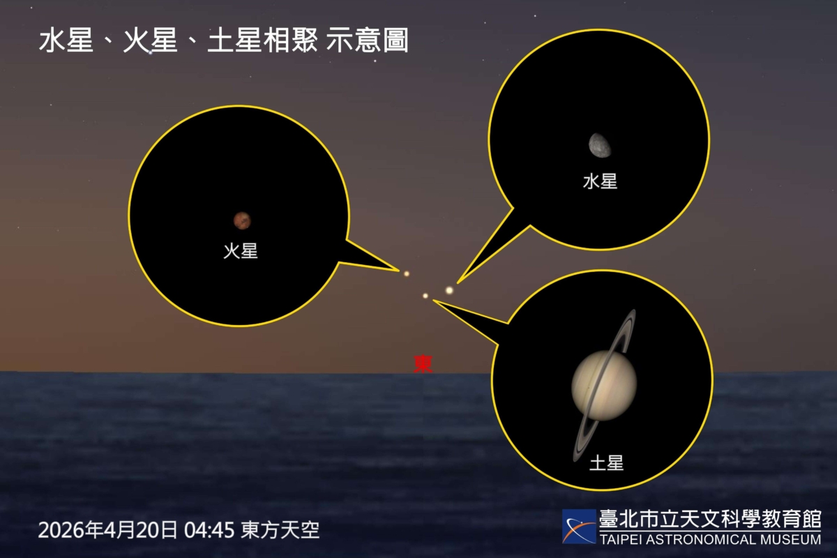 不僅流星雨、月全食,2026年還有多次肉眼可見的「行星合」現象。其中以3/9「金星合土星」、4/20「火星合土星」與「水星合土星」、11/16「火星合木星」最值得欣賞,於天空相映生輝。