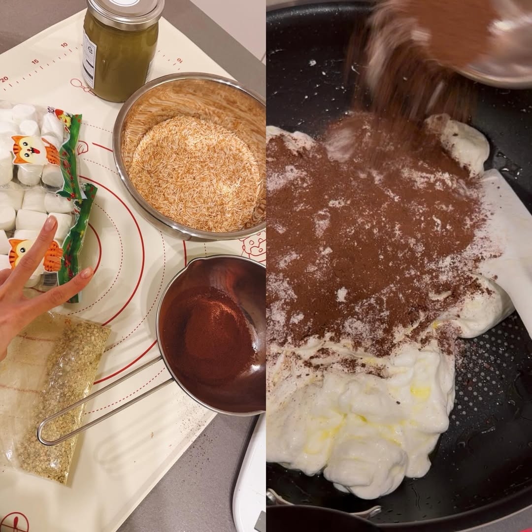 - 取適量可可粉與脫脂奶粉混合,放入加熱中的奶油與棉花糖