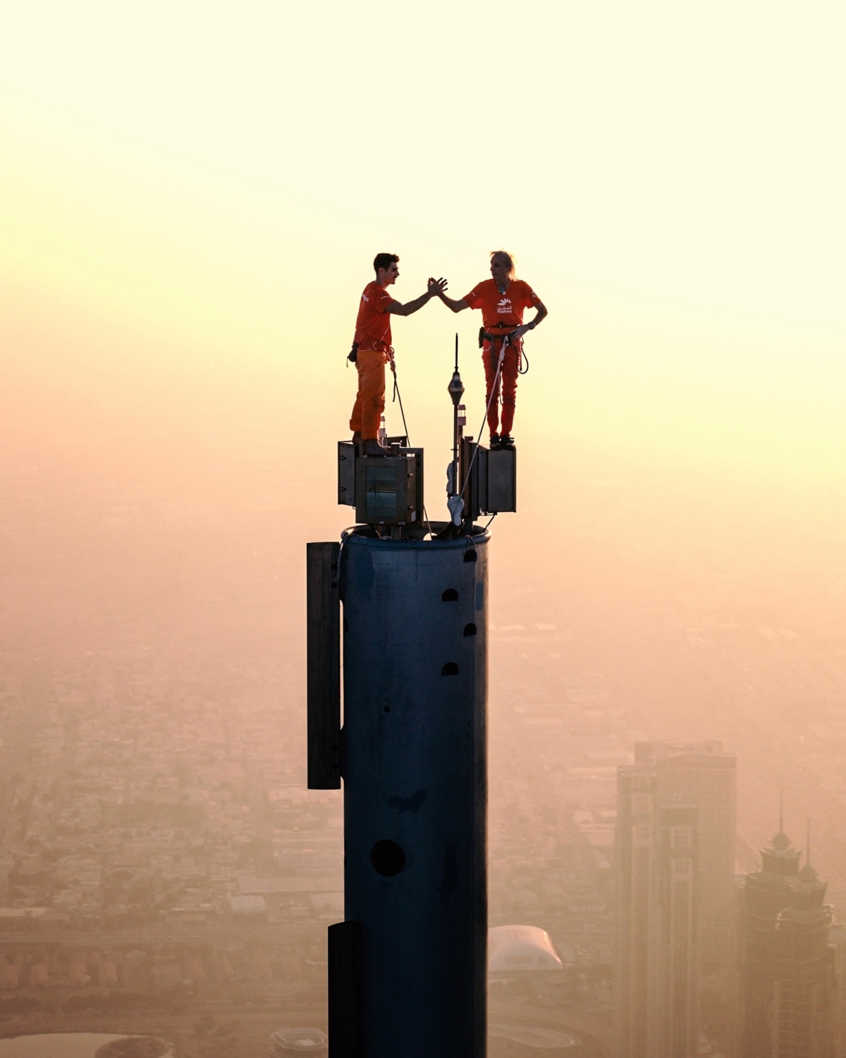 有「法國蜘蛛人」之稱的 Alain Robert 在 2023 年帶著年輕的後輩 Alexis Landot 再次挑戰。Alain 早在 2011 年就曾獨自徒手攀爬這座巨塔,而這次則帶有某種傳承意味。兩人利用吸盤與專業登山裝備在塔面外側移動,不僅要對抗高空低溫,還必須在極薄的氧氣環境下維持專注。純靠手腳抓握玻璃窗緣的狹小突起,這場攀爬整整持續了 9 個小時。Alain 表示,哈里發塔最難的地方在於其技術性,每隔 2 到 3 公尺,建築的抓握點和角度就會改變,必須不斷變換攀爬技巧。