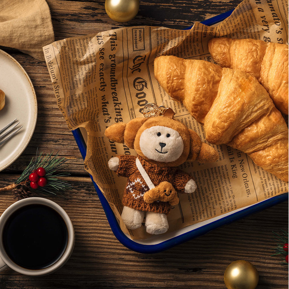另一款同步開賣的玩偶吊飾則以經典可頌為靈感,人氣Bearista熊寶寶換上可頌造型裝扮,身穿溫潤針織上衣,搭配超吸睛的可頌造型斜背包,細節滿滿。無論是掛在包包、鑰匙圈或作為日常小配件,都能瞬間提升療癒指數,非常欠收!