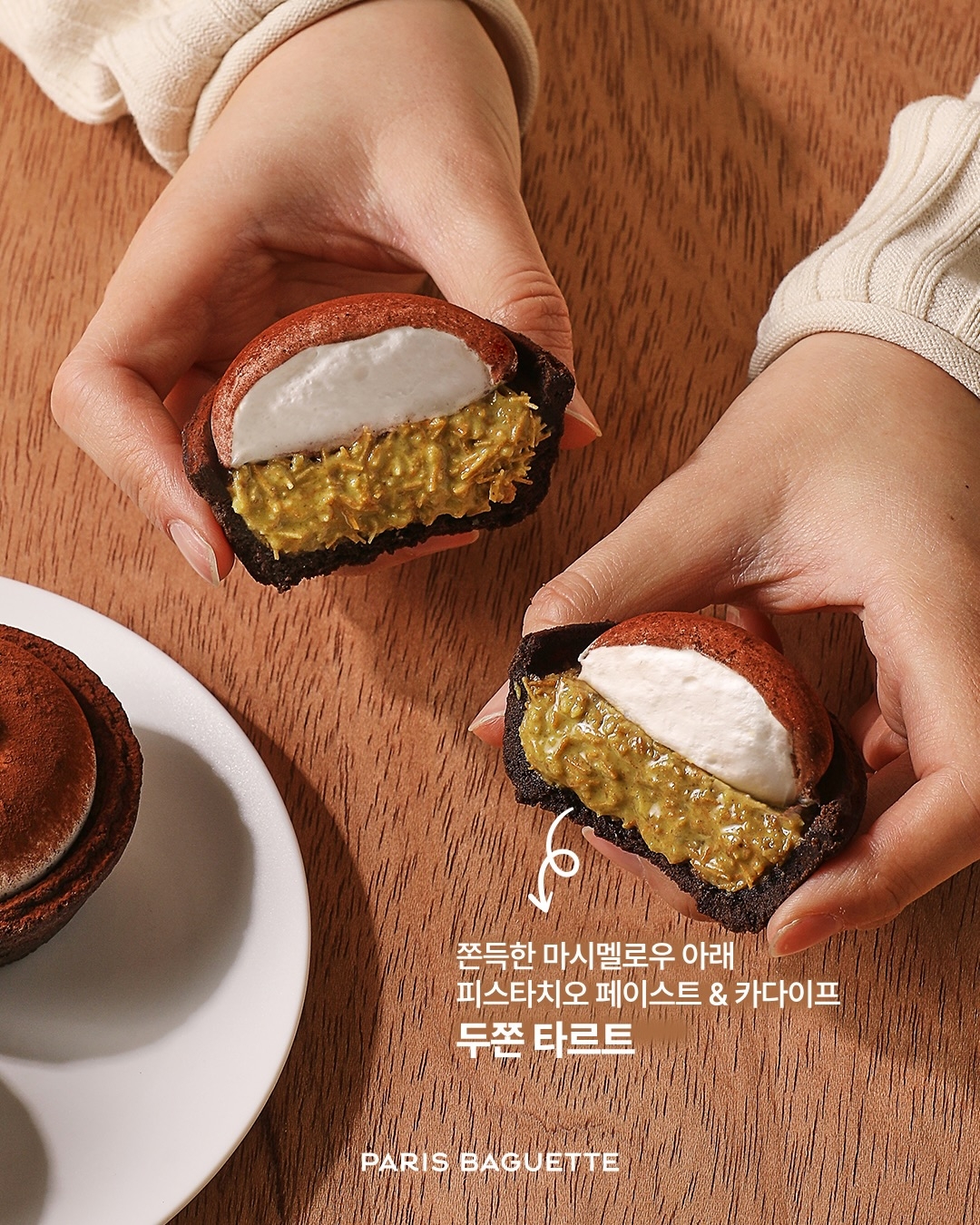 「두쫀(Dujjon)」結合了杜拜與 Q 彈的韓文縮寫,直接點出這款塔類甜點的兩大特徵,為了增加口感延展性,塔皮底部鋪墊了一層布朗尼蛋糕與麻糬, 最上層則覆蓋了混合卡達拉菲麵絲的開心果甘納許,並淋上鏡面巧克力封頂。這款甜點的結構相當精細,從最底層的酥脆塔皮、中間軟糯的麻糬,到上層帶有顆粒感的開心果餡,清楚劃分出三種截然不同的質地,是針對喜歡豐富咀嚼層次的族群所設計。