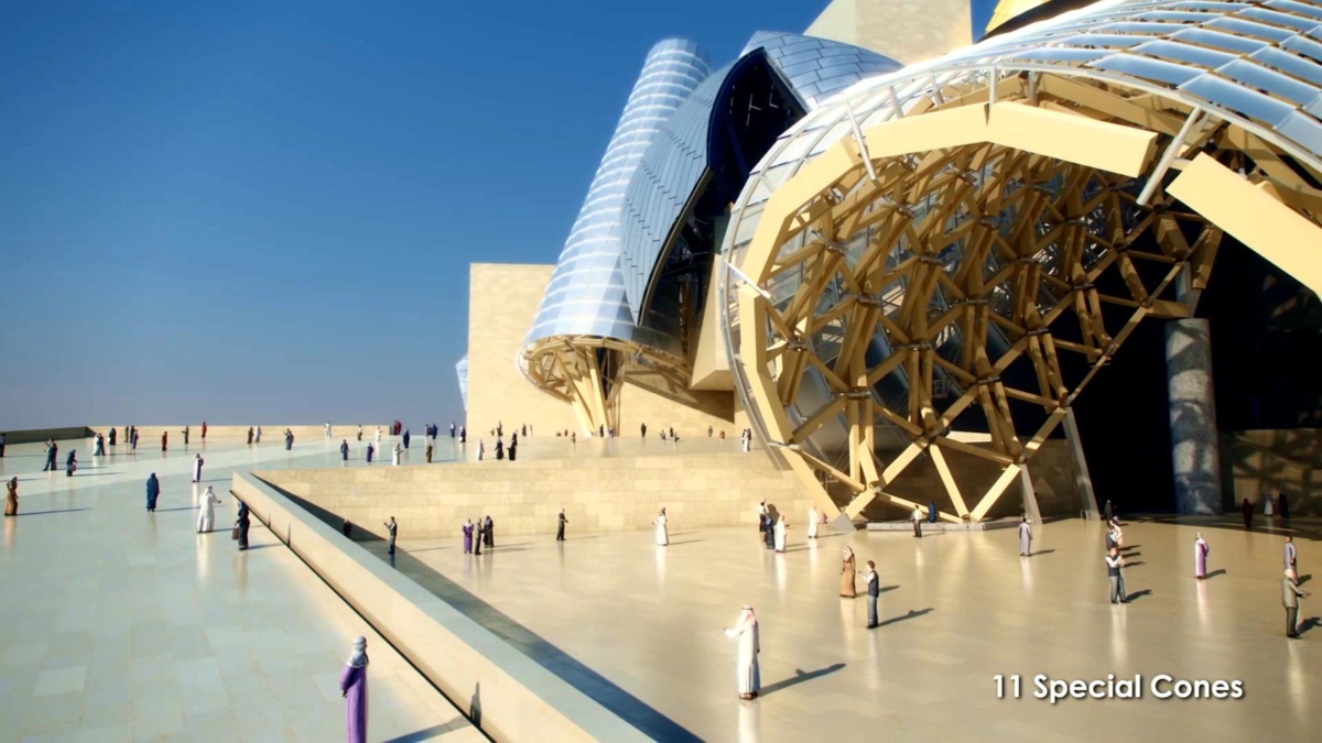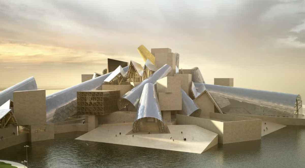 這座建築的規模是西班牙畢爾包古根漢的 12 倍大!法蘭克·蓋瑞從傳統的中東 「風塔」(Barjeel) 汲取靈感,將其轉化為巨大的圓錐體與方形結構,具有實際的通風冷卻功能,建築三面環水,巨大的懸挑結構在海上投下陰影,從遠處看,就像是一堆巨石在沙漠與海洋的交界處翻滾及碰撞。