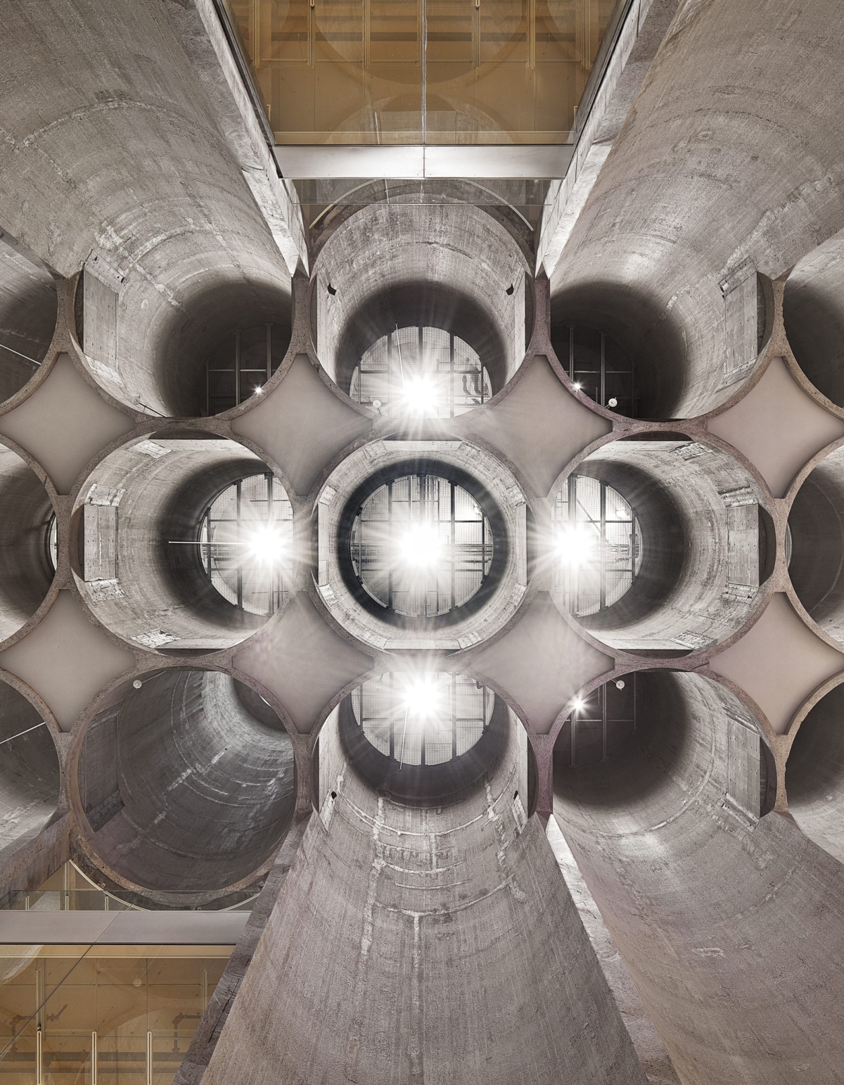 這是一個將工業廢墟變身為藝術殿堂的絕佳案例。Kunstsilo 前身是一座建於 1935 年的大型穀倉,曾是功能主義建築的代表,如今被改造為展示北歐現代主義藝術的重鎮。建築團隊大膽切開了原本封閉的混凝土圓筒,將內部打通成一個高聳入雲的 「筒倉大廳」,抬頭仰望數十個圓形切口交錯,光線從頂部玻璃天窗傾下,營造哥德式教堂般的垂直崇高感。