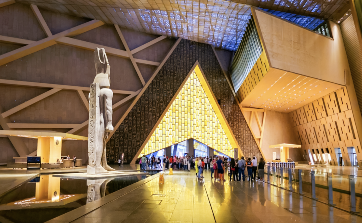 歷時二十多年打造,座落於吉薩金字塔群僅 2 公里處,是目前全球最大的單一文明博物館。由愛爾蘭 Heneghan Peng 建築事務所設計,博物館的外牆使用了大量半透明的雪花石膏,白天陽光透過石板灑入室內,形成幾何狀的光斑;夜晚則由內向外發光,如一座巨大的沙漠燈籠。入口處的「懸掛方尖碑」是世界上首座展示方尖碑底部的設計,能仰望古埃及工匠的雕刻細節。