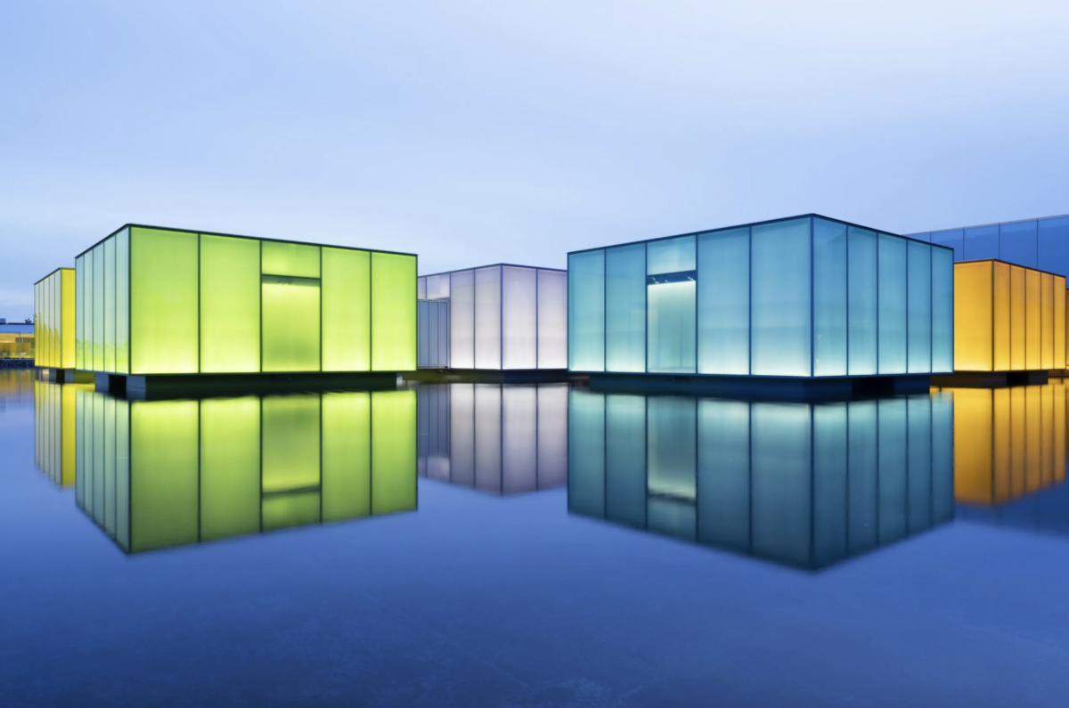 這是一座「漂浮」在瀨戶內海旁的美術館。建築大師坂茂利用了物理學上的浮力概念,設計了八個色彩鮮豔、可移動的玻璃展廳Movable Exhibition Rooms,它們漂浮在水盤之上,隨著夜間燈光亮起,有如水面上的寶石燈籠。