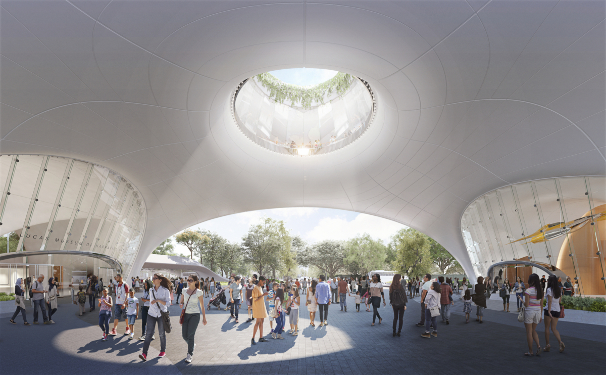 由《星際大戰》創作者喬治·盧卡斯創立,這座博物館的外型就像一艘降落在洛杉磯博覽會公園的銀色外星飛船。建築師馬岩松設計了一個長達 400 公尺的流線型建築,像是一朵雲,又像是一艘來自未來的星艦,漂浮在洛杉磯的博覽會公園之上。建築底部是架空的,形成了一個巨大的公共公園,讓市民可以自由穿梭。內部的電梯與走廊如同天然溶洞般蜿蜒曲折,充滿了生物有機體的未來感。