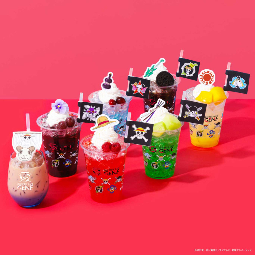 飲品同樣充滿細節巧思,不僅使用印有海賊標誌的專屬杯款,吸管上也插著隨風飄揚的海賊旗。每一款飲料都對應角色個性設計,例如魯夫是酸甜的蔓越莓汁、索隆是清爽的哈密瓜蘇打、羅賓則是成熟風味的葡萄飲品。杯頂鮮奶油還會插上角色專屬小紙卡,逛街走累了,不妨來這裡坐下來,在澀谷的「偉大航道」補充體力。