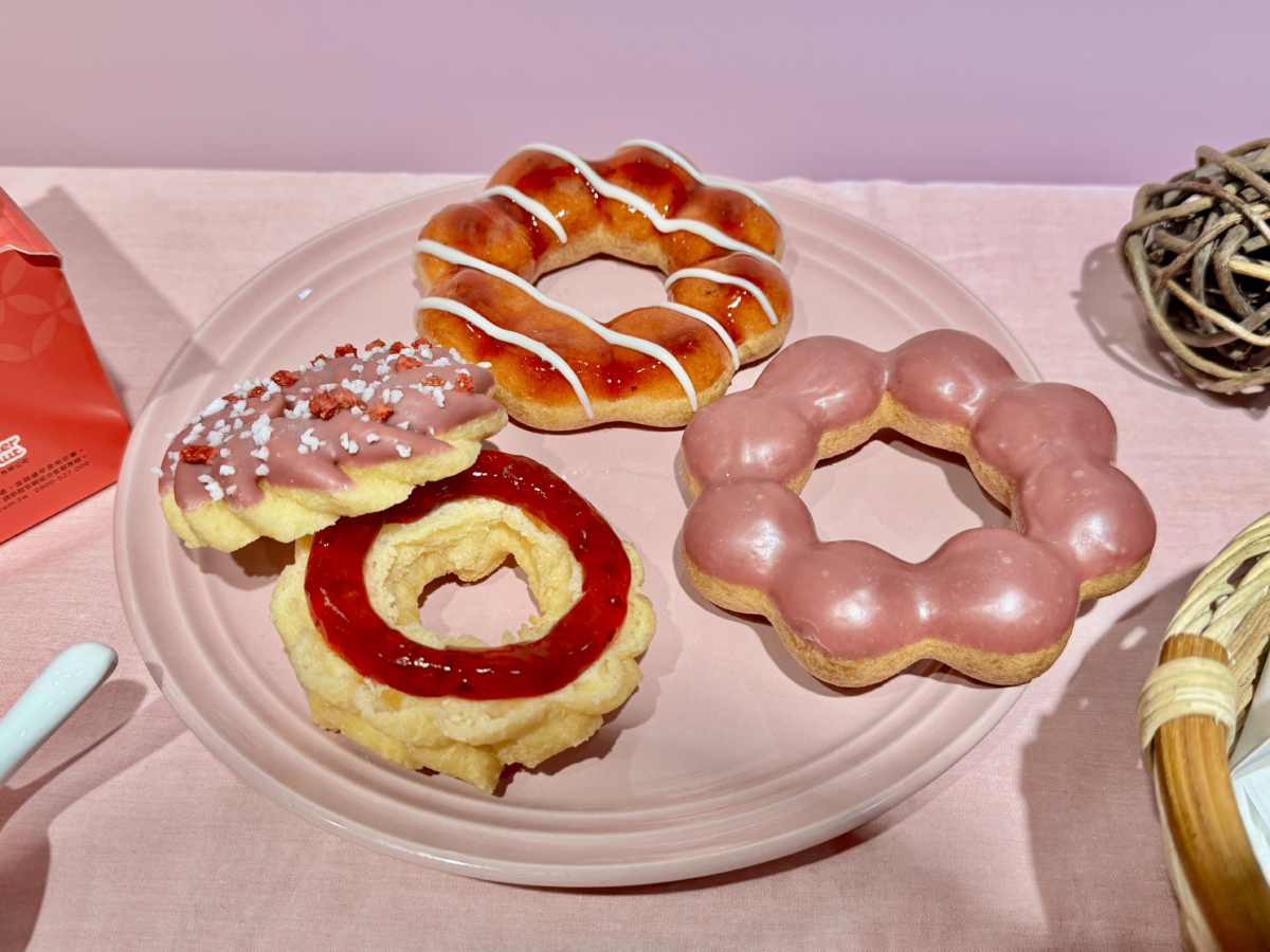 這次以「莓果饗宴」為主題推出7款甜甜圈。「小草莓巧貝」外表沾滿酸甜可口的草莓沾醬,咬開後裡面擠滿香甜鮮奶油,粉嫩外型可愛到讓人捨不得吃。「莓果多重奏波堤」把Q彈的草莓波堤先沾上藍莓果醬,再裹上香甜草莓可可醬,雙重莓果醬料疊加出超滿足的多層次風味,一口咬下藍莓瞬間充滿口腔。「藍莓乳酪波堤」把香甜草莓波堤剖半,中間擠滿cream cheese跟藍莓果餡,乳酪的鹹香搭配莓果的酸甜,未到恰到好處。
