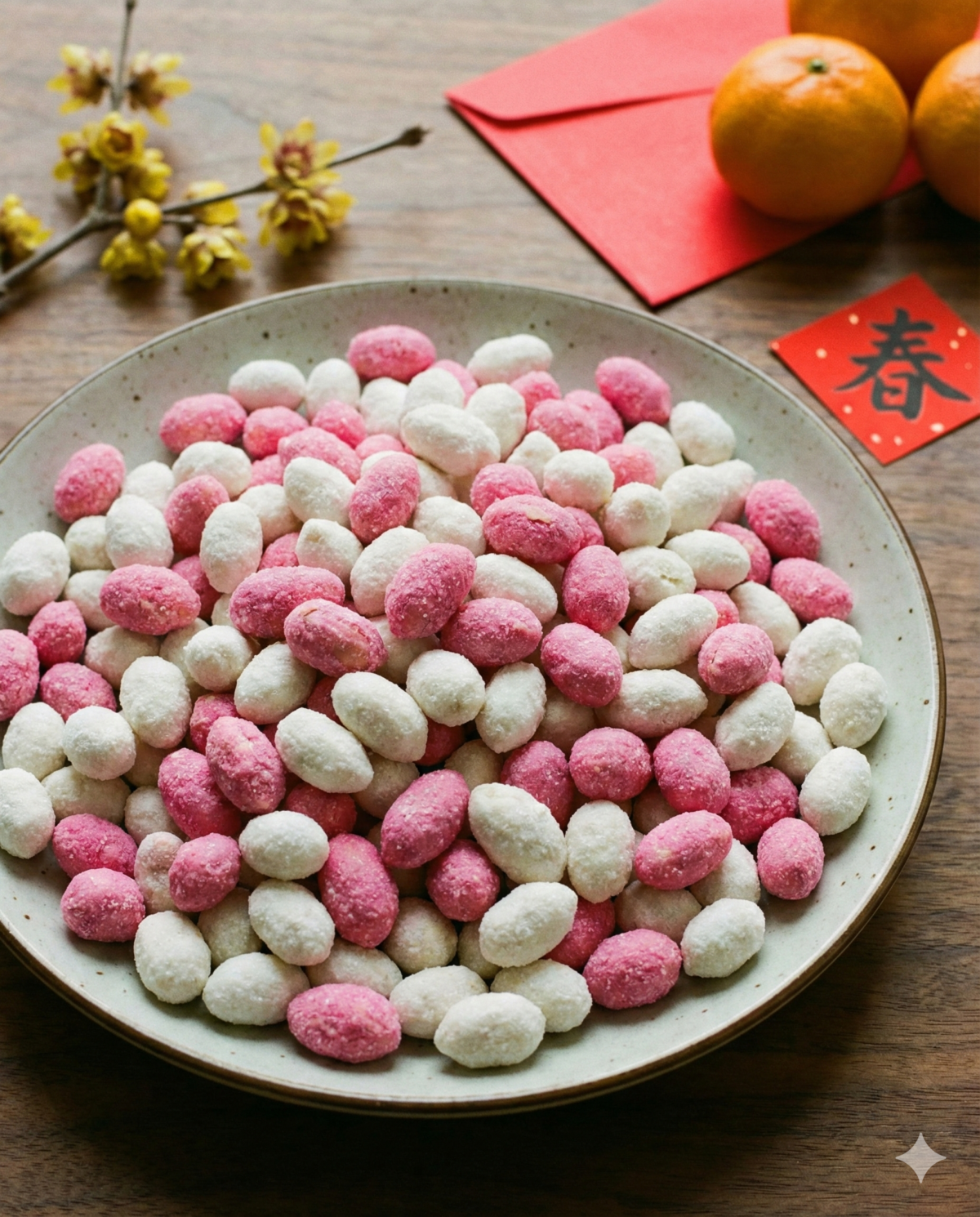 紅白雙色的硬脆糖霜包裹著整顆炒香花生仁,咬碎糖衣時,焦香與甜味在口中融合,越嚼越香,是許多長輩心中的配茶首選。這款糖果是農曆正月初九「拜天公」的重要供品,因此又稱「天公豆」。花生象徵長壽,「仁」諧音「人」,寓意人丁興旺;剝開花生殼則有脫胎換骨、去舊迎新的含義。紅色討喜氣、白色象徵純潔,雖然熱量不低,但過年少了它,好像就少了一味傳統年味。