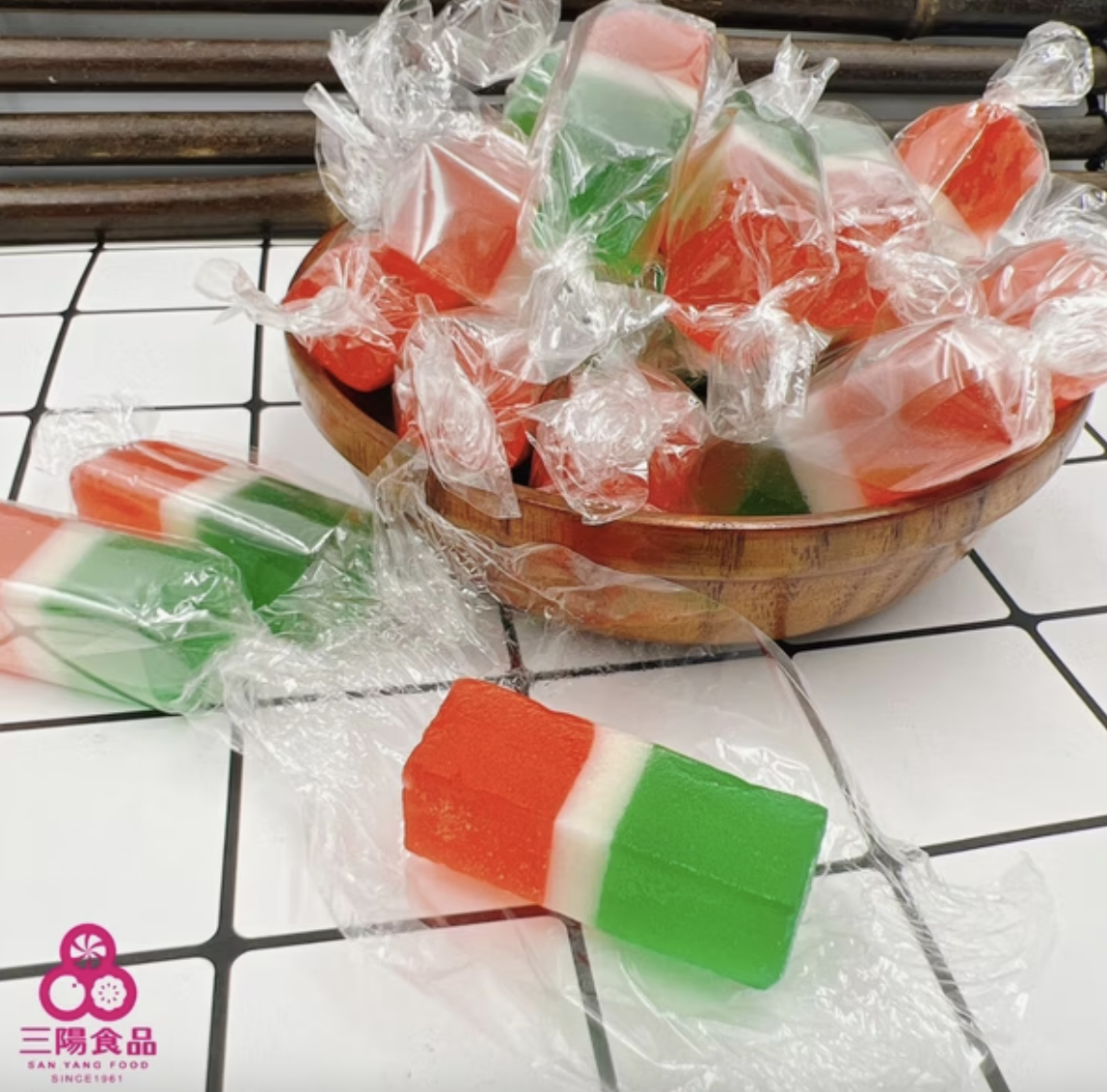 紅、綠、白三層分明的長方體軟糖,是過年糖果盒裡最具爭議的存在。口感偏寒天的脆軟質地,不是現在流行的Q彈軟糖,有人嫌它甜到發膩,也有人愛那份單純的糖香。主要成分為洋菜粉與砂糖,三種顏色象徵喜氣與長青祝福。對年輕人來說或許復古,對長輩而言卻是物資缺乏年代的高級甜點,光看到就充滿懷舊感,也是過年回鄉下經常會看見的甜品之一。